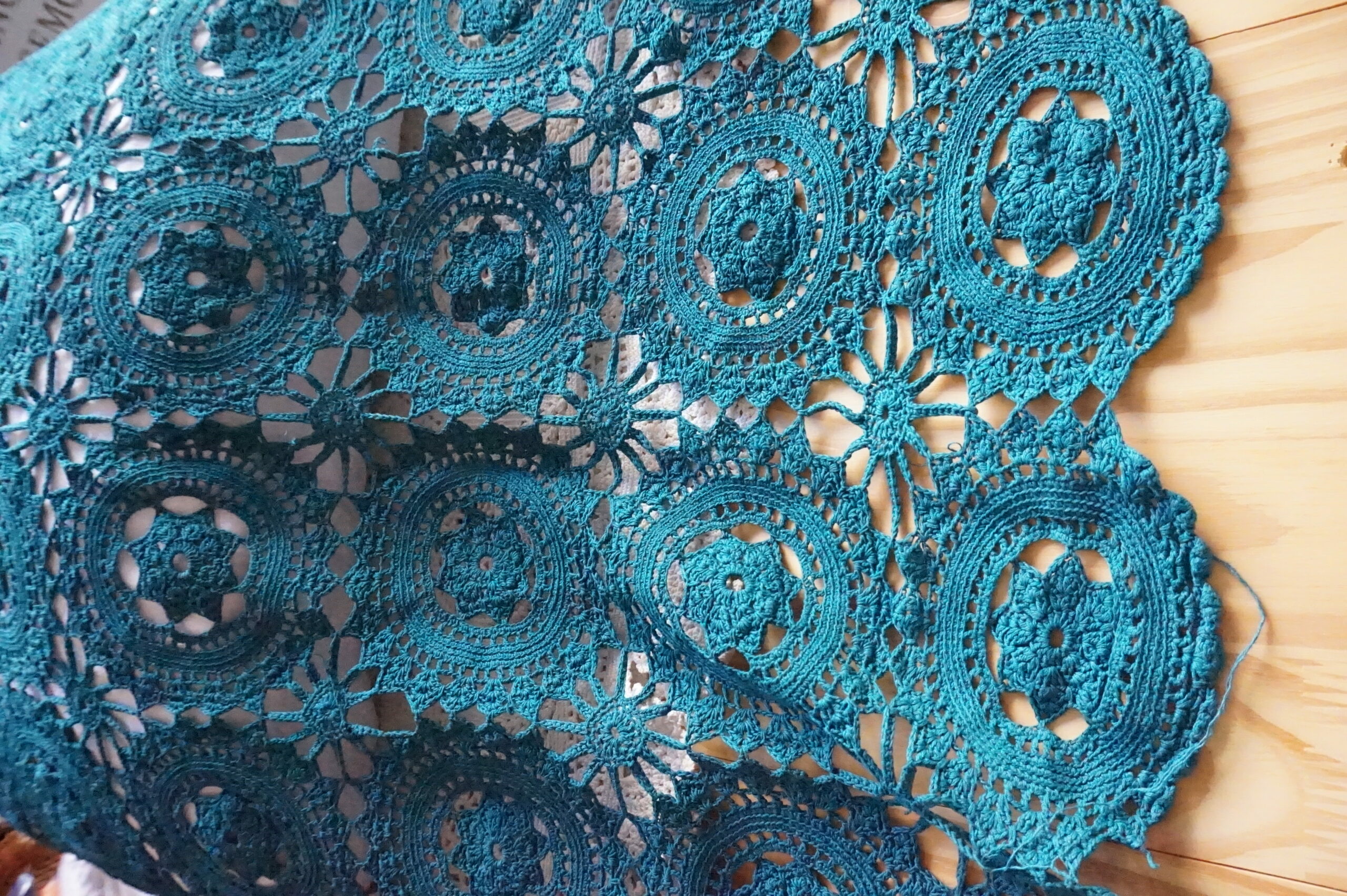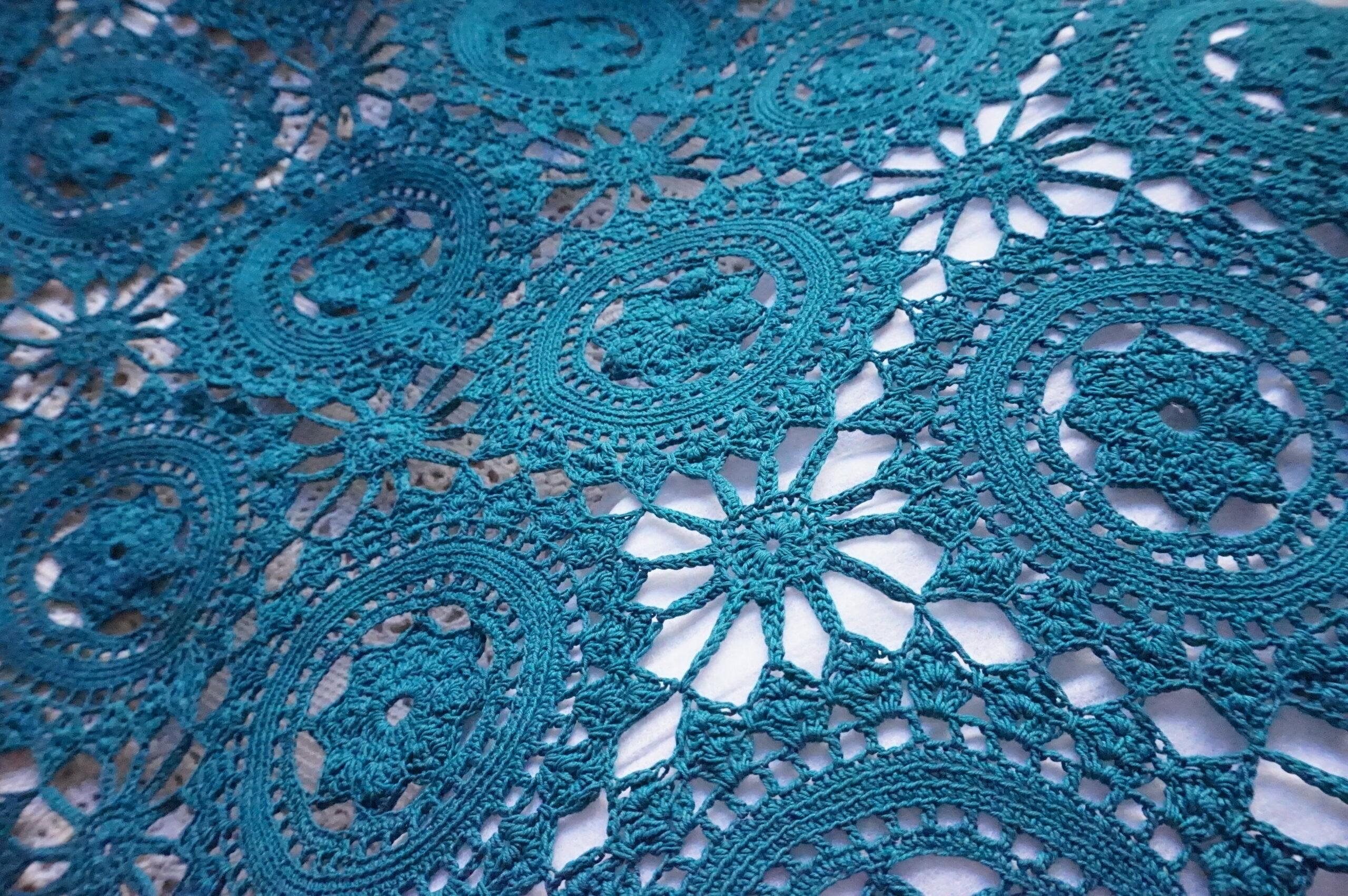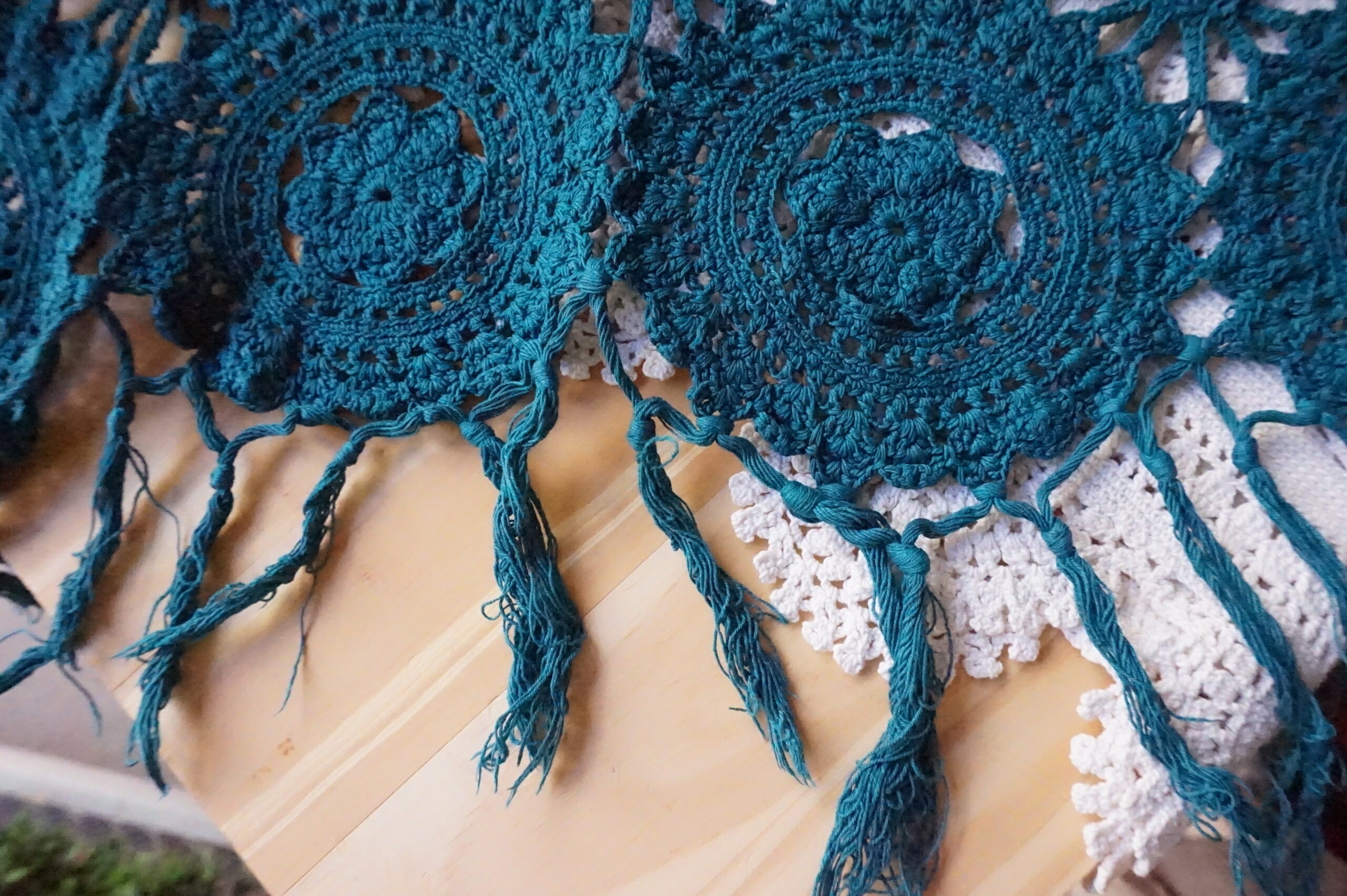 Couvre‑lit ancien en crochet, teint émeraude – 200×210, franges Années 1930–1950