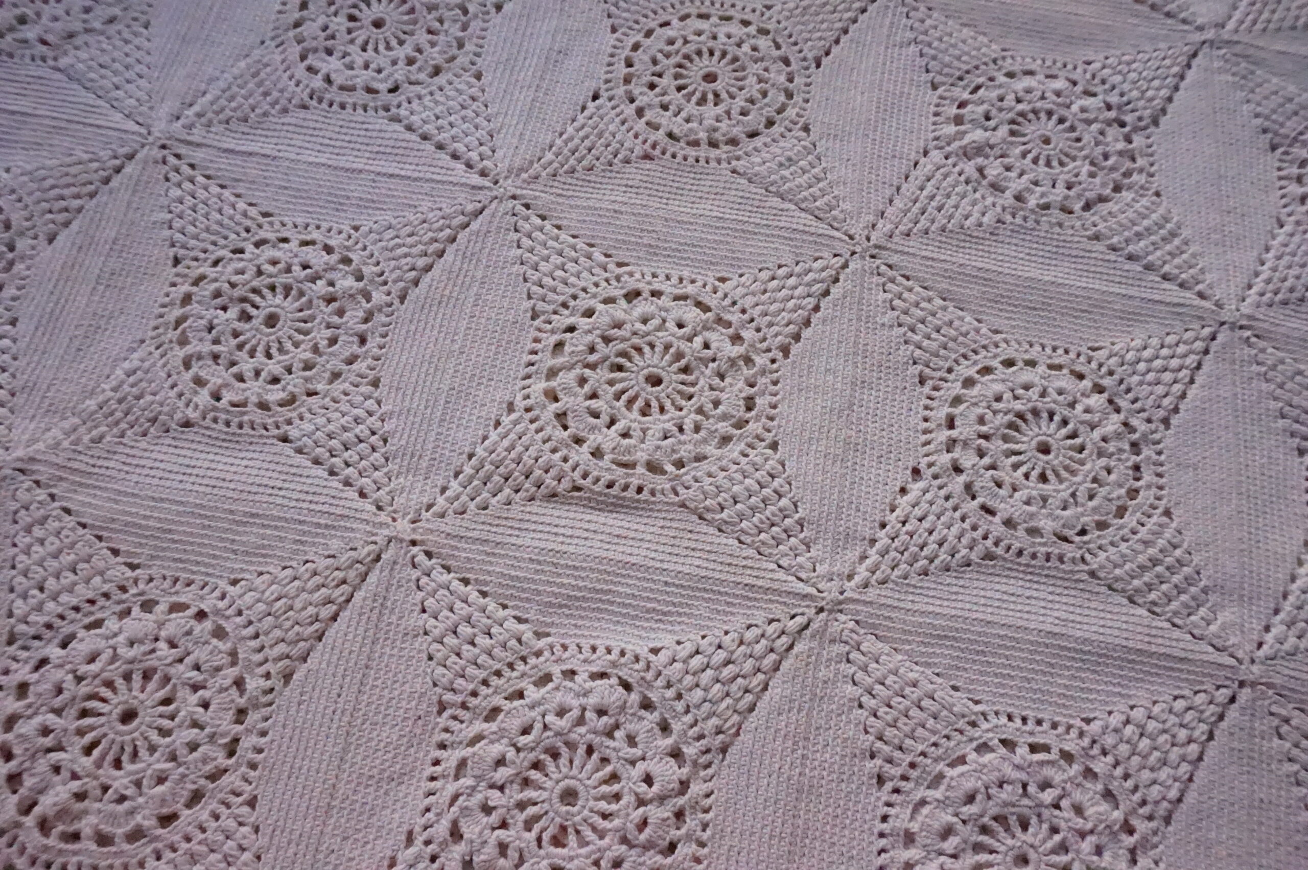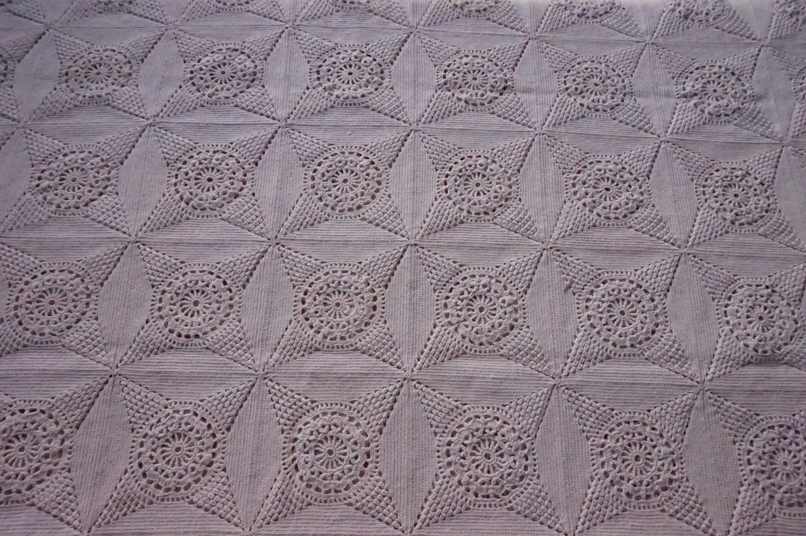 Couvre‑lit ancien en crochet couleur sable – 165×180 (années 1940–1960)