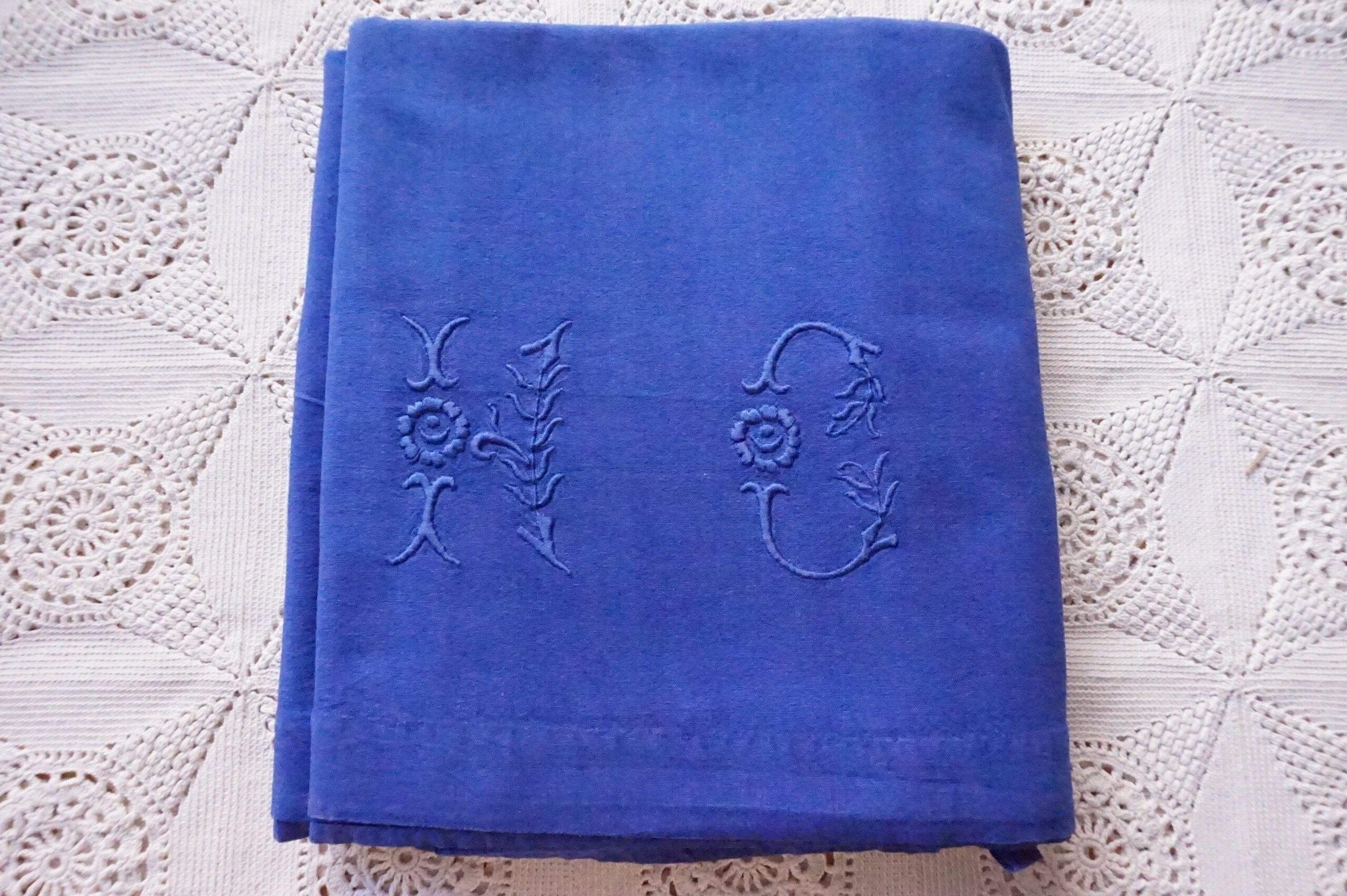 Drap ancien teinté bleu , monogramme HC imposant et délicat – 195×250 (années 1900–1930)