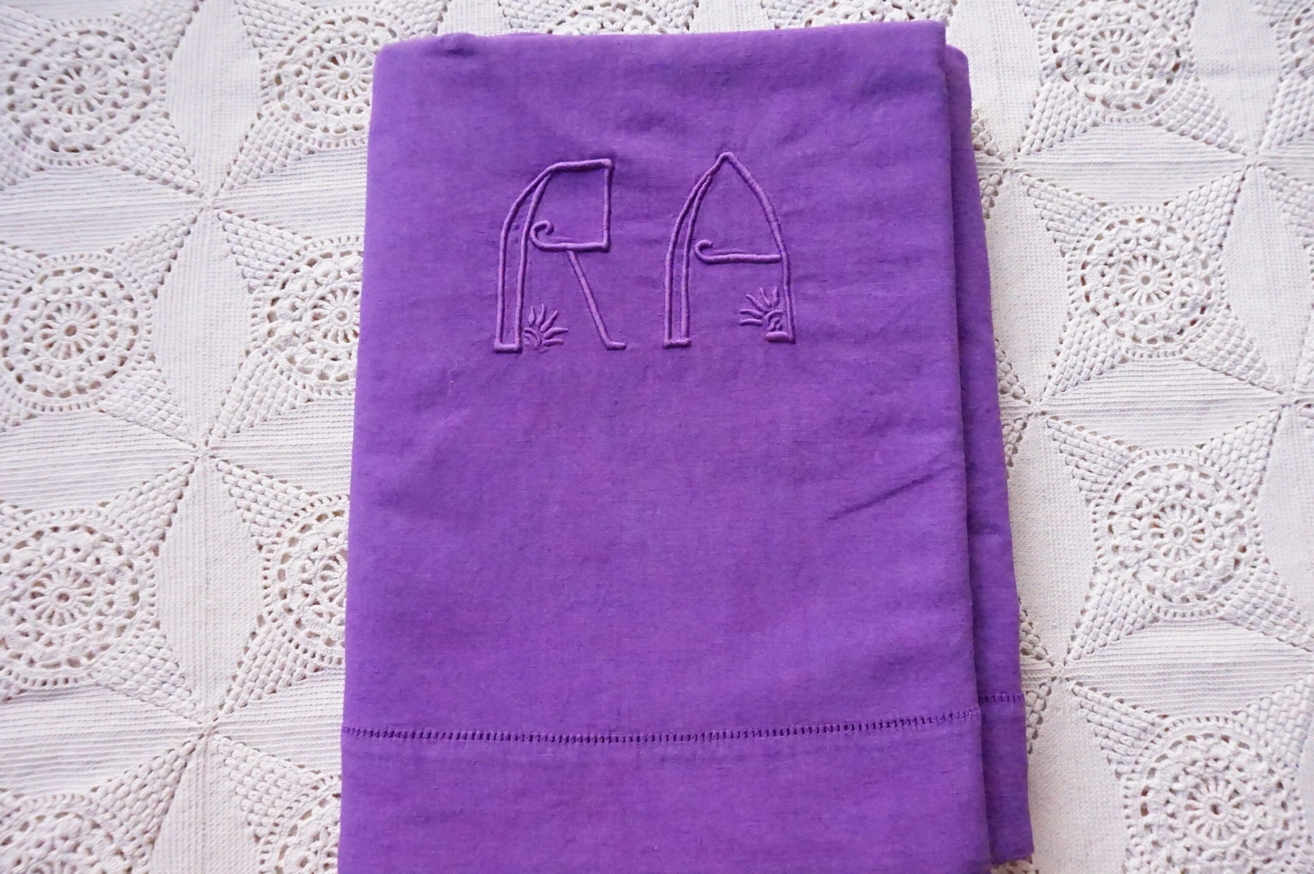 110,00 € Ajouter au panier110,00 €Drap ancien en lin (années 1900–1930), monogramme RA, teint violet dans notre atelier. Dimensions 200×310 cm, léger jour en bordure, très bel état. Prix : 110 €