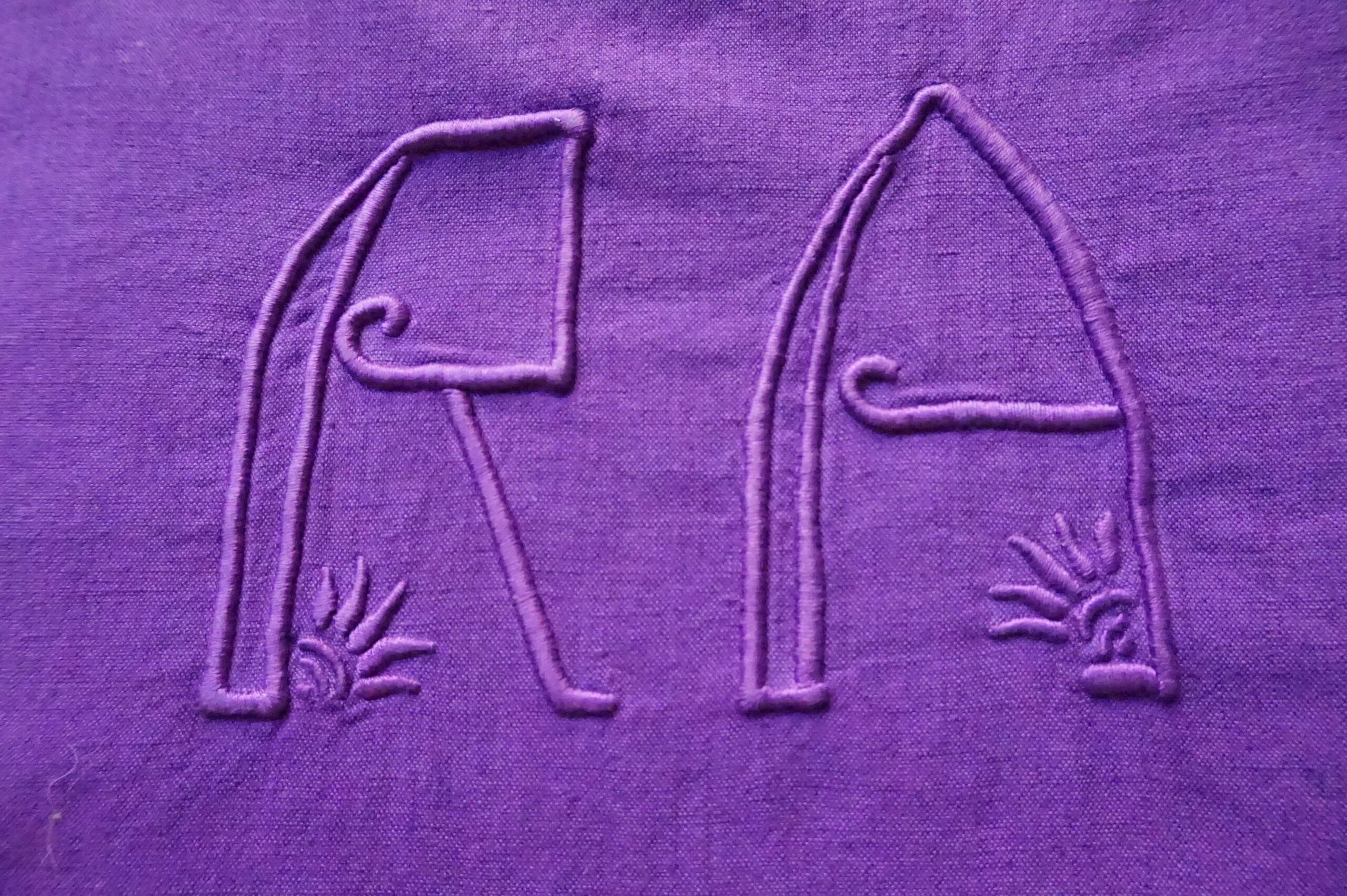 Drap ancien en lin, monogramme RA, teint violet –200×310, léger jour en bordure(années 1900–1930)