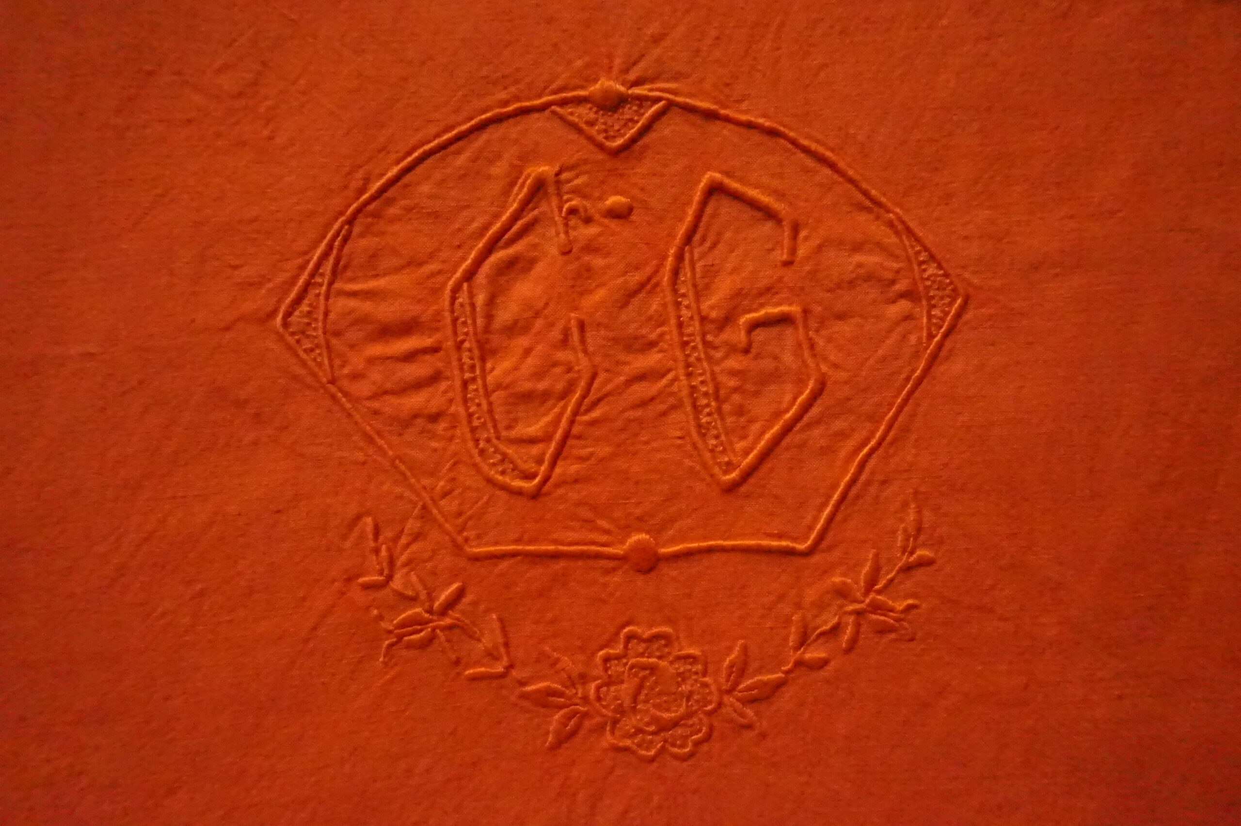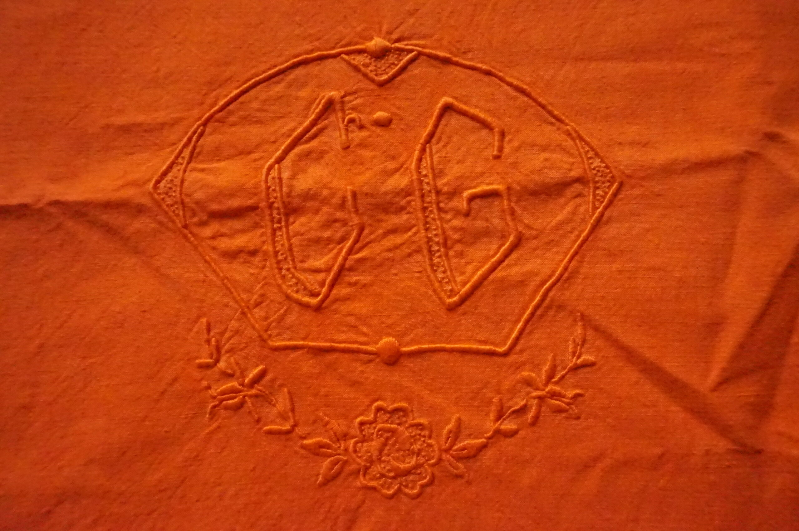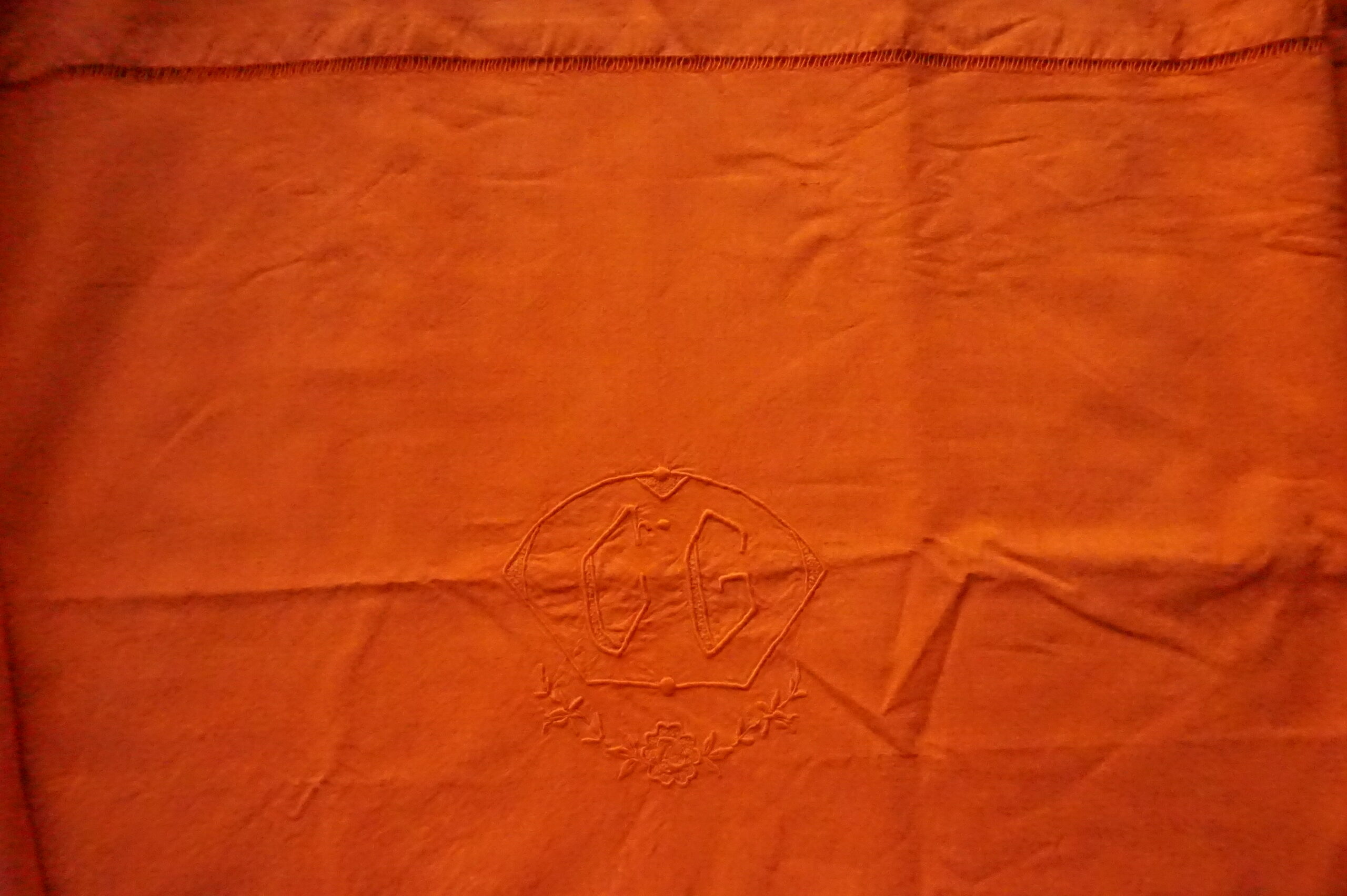 Drap ancien en lin, monogramme CG imposant et délicat, teint orange signature – 200×300 (années 1900–1930)