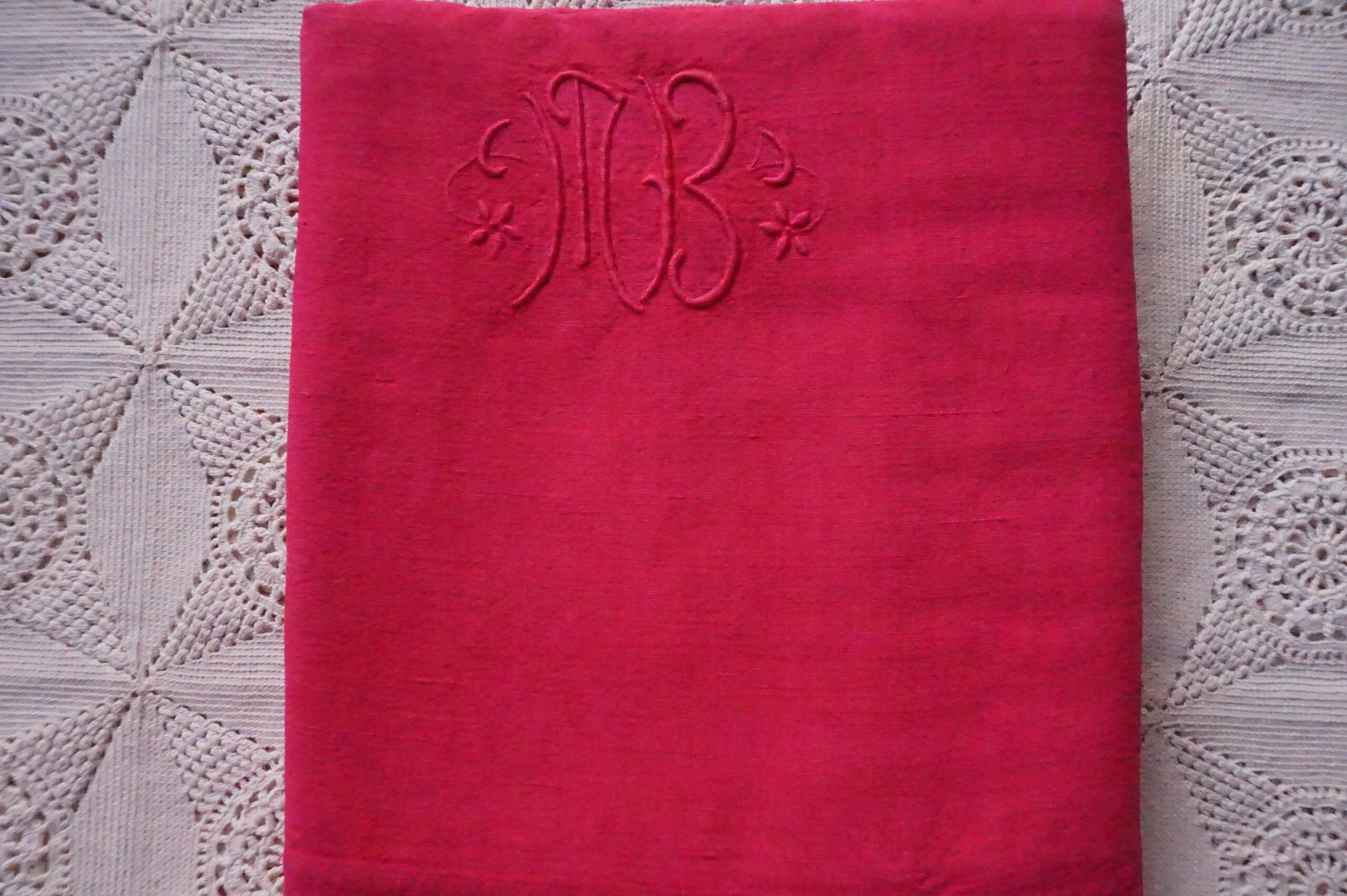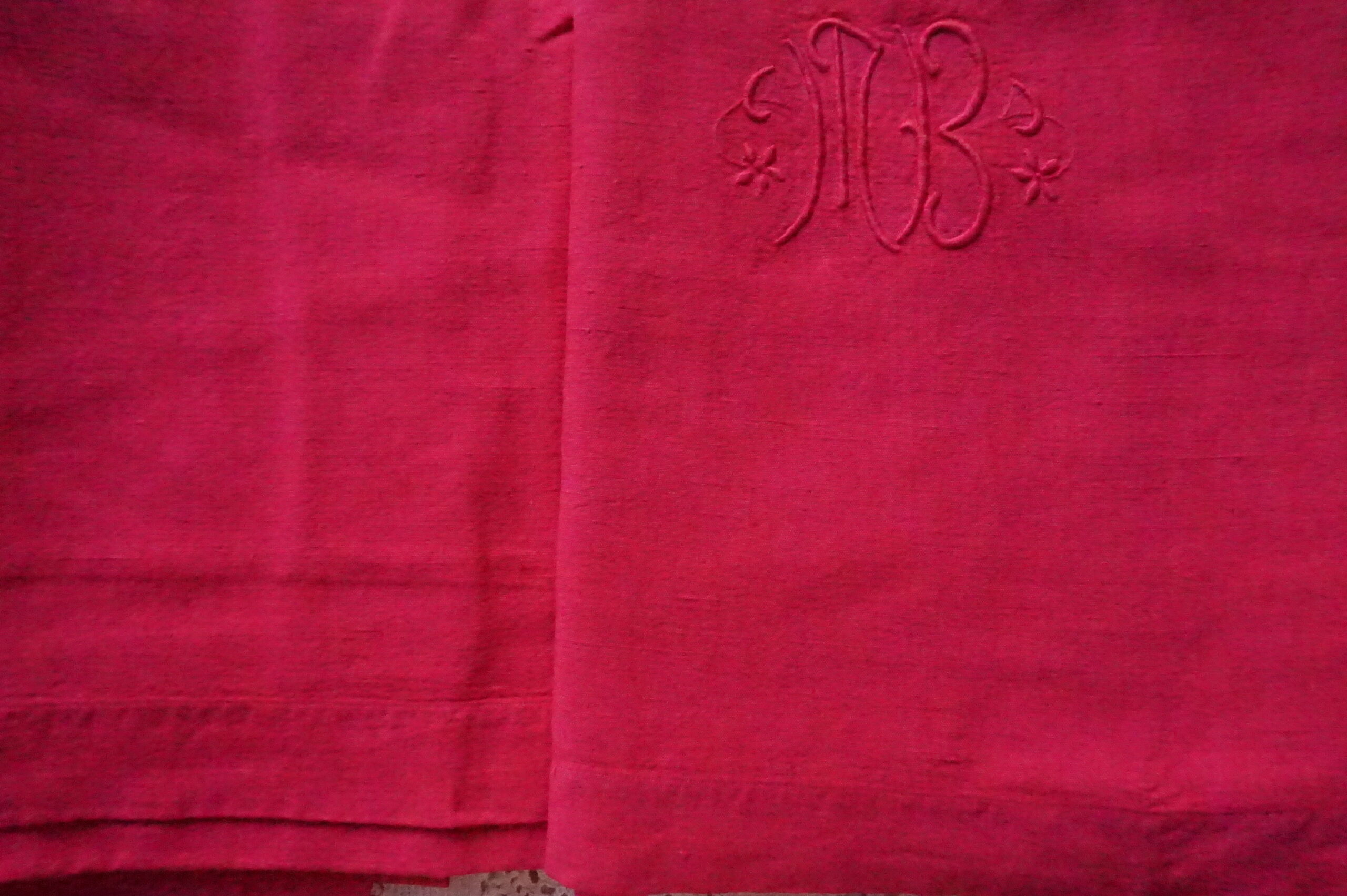 95,00 € Ajouter au panier95,00 €Drap ancien en lin (années 1900–1930), monogramme MB, teint rose fuchsia dans notre atelier. Dimensions 185×300 cm, très bel état. Prix : 95 €