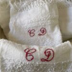 Lot de 5 serviettes de toilette en éponge ancienne, brodées main CD, avec franges délicates. Format 58×85 cm. Datation : années 1940–1955. Linge propre, souple et prêt à l’usage.