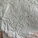 Bavoir ancien en coton fin, brodé de papillons en relief et ajouré. Bordure brodée, pièce délicate et raffinée.
