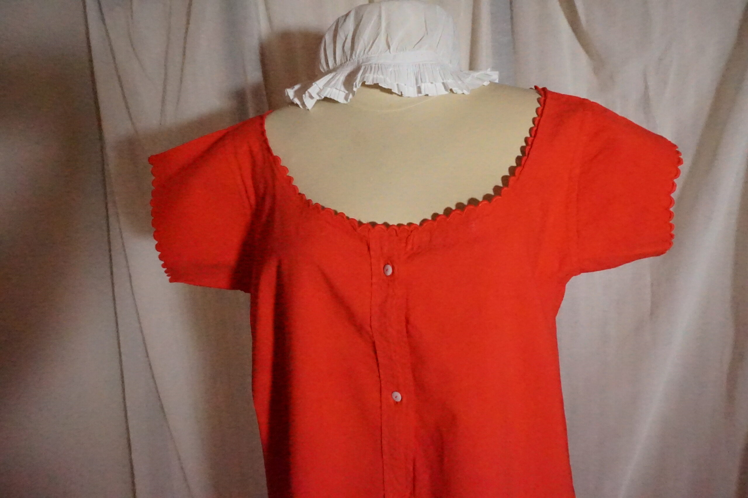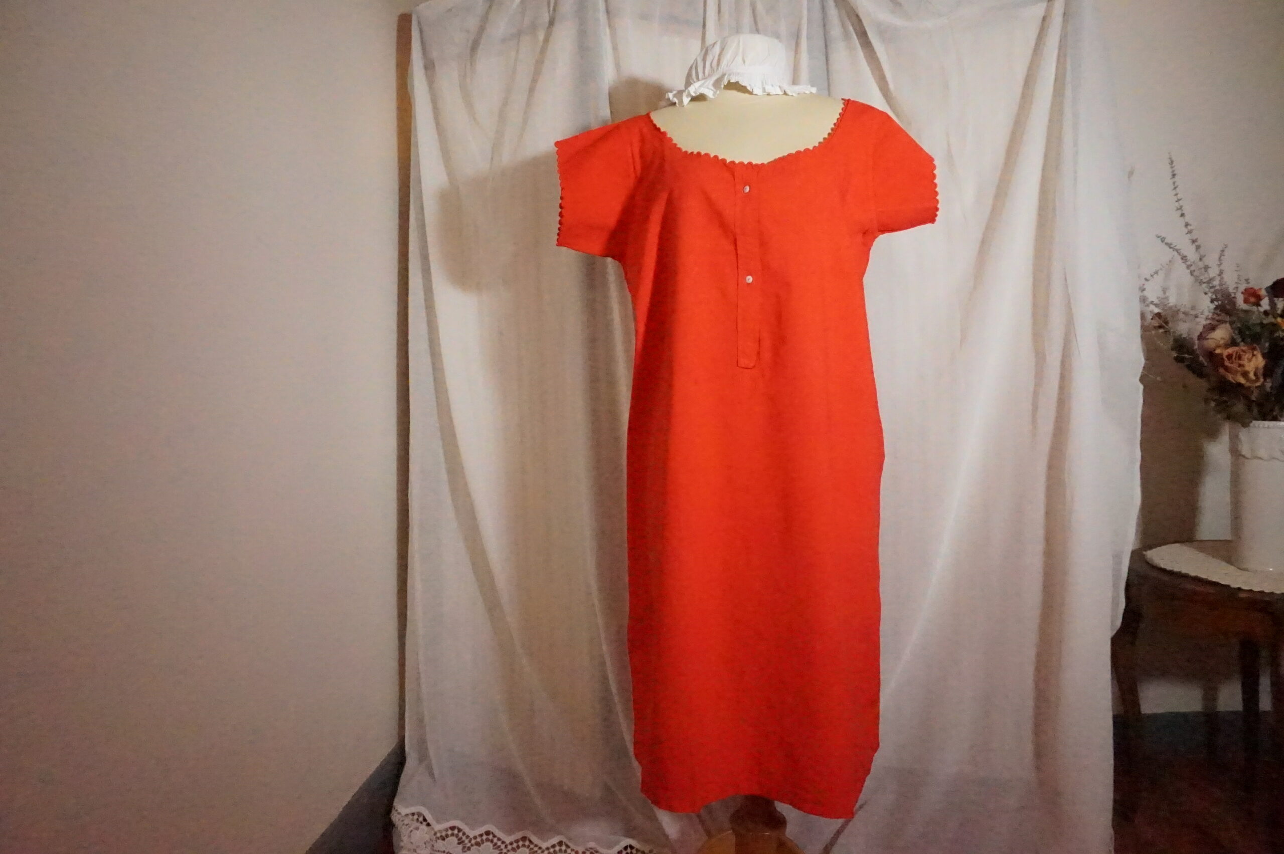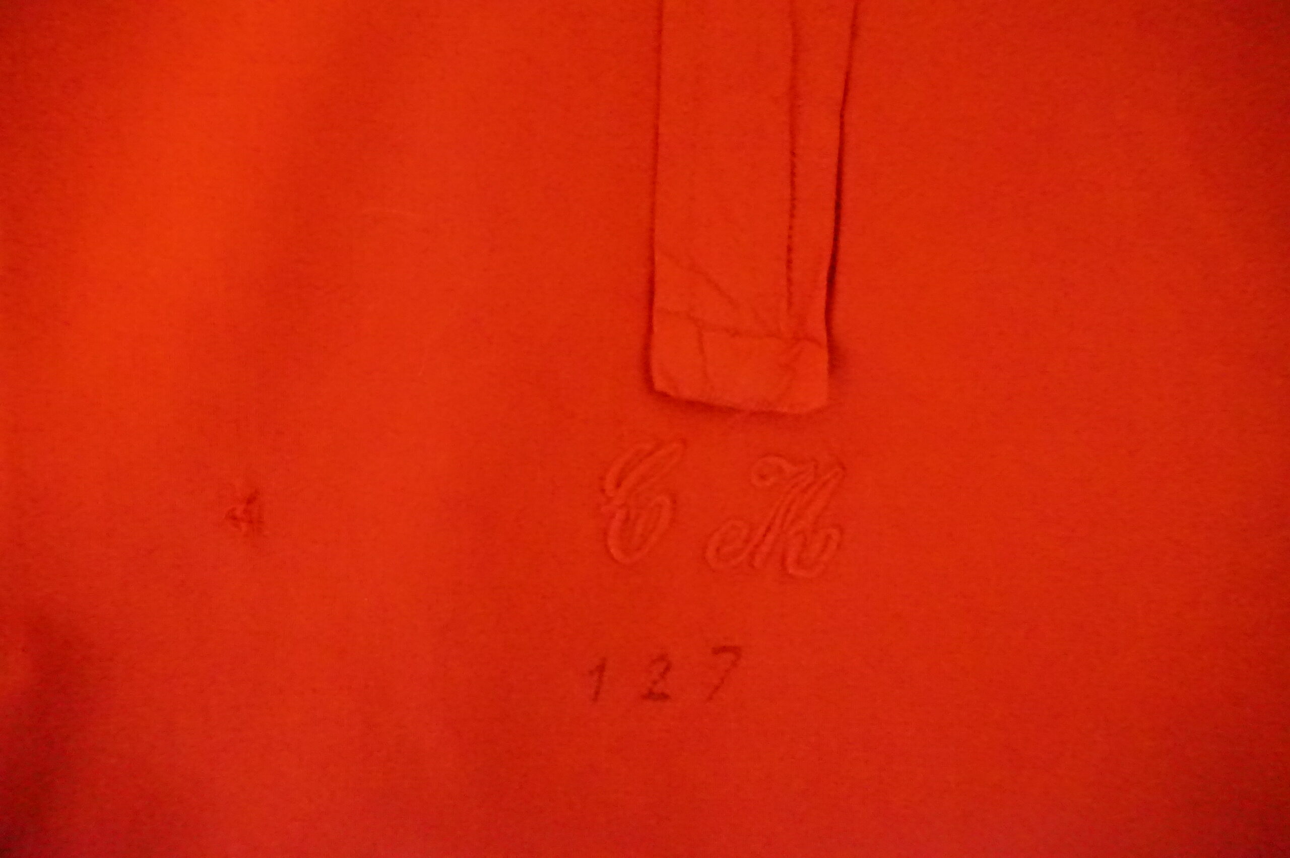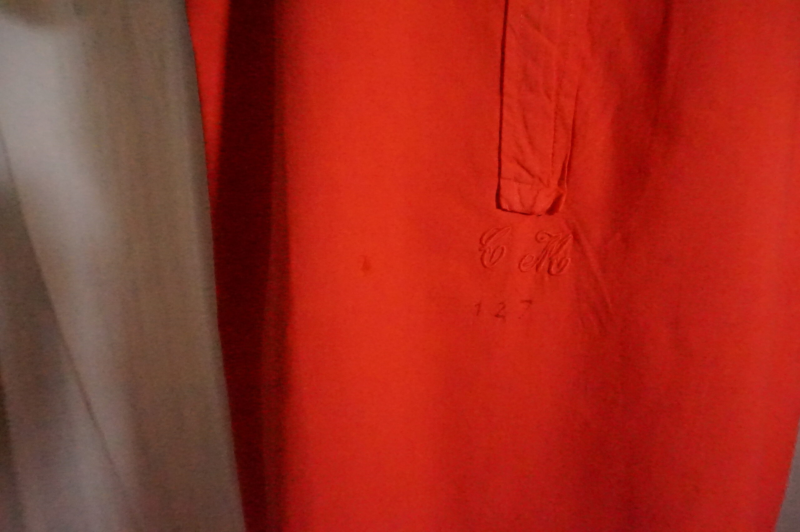 Chemise de nuit teintée rouge, brodée CM 127, un léger point signalé sur photo, et quelques traces du temps.