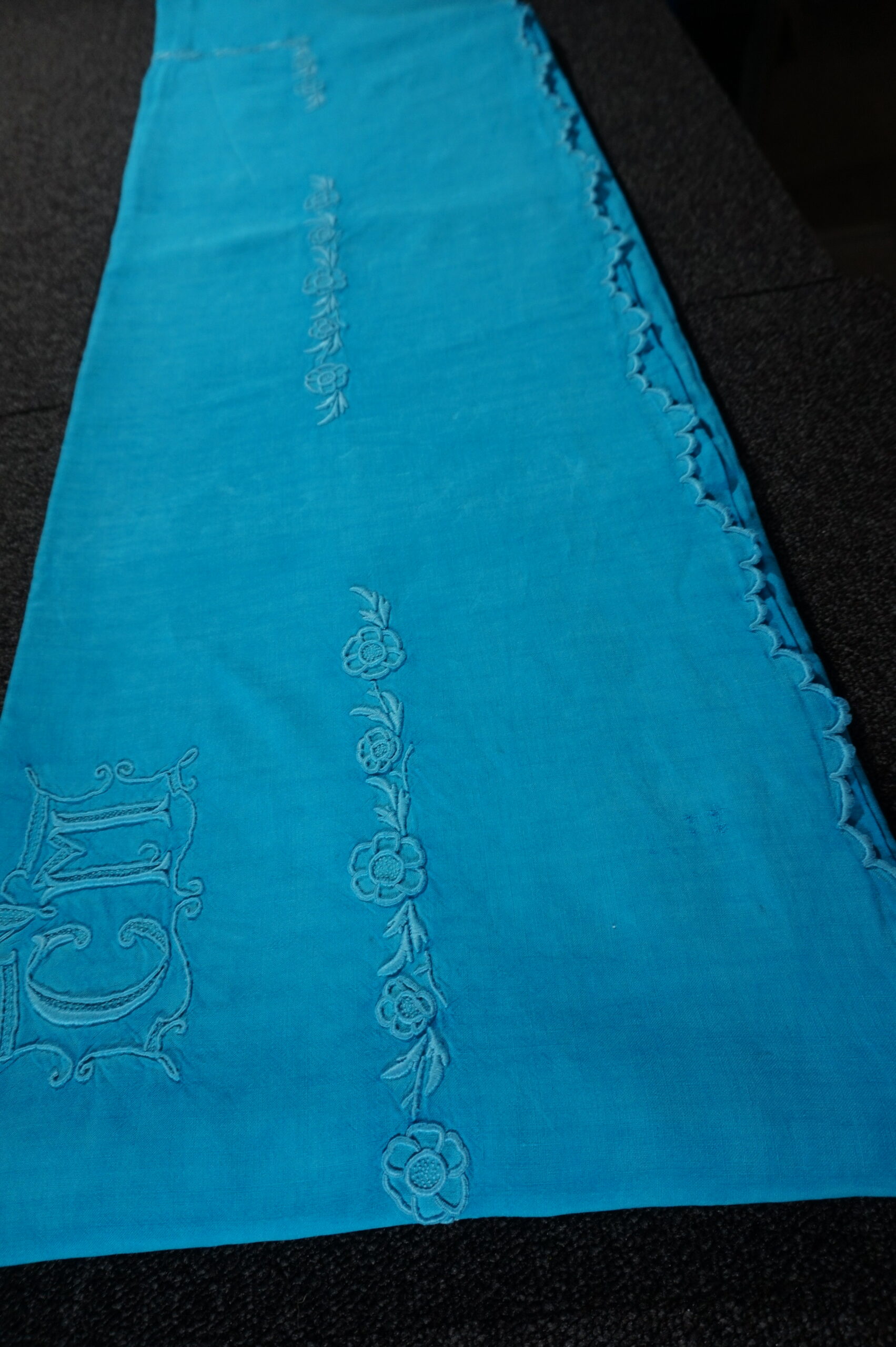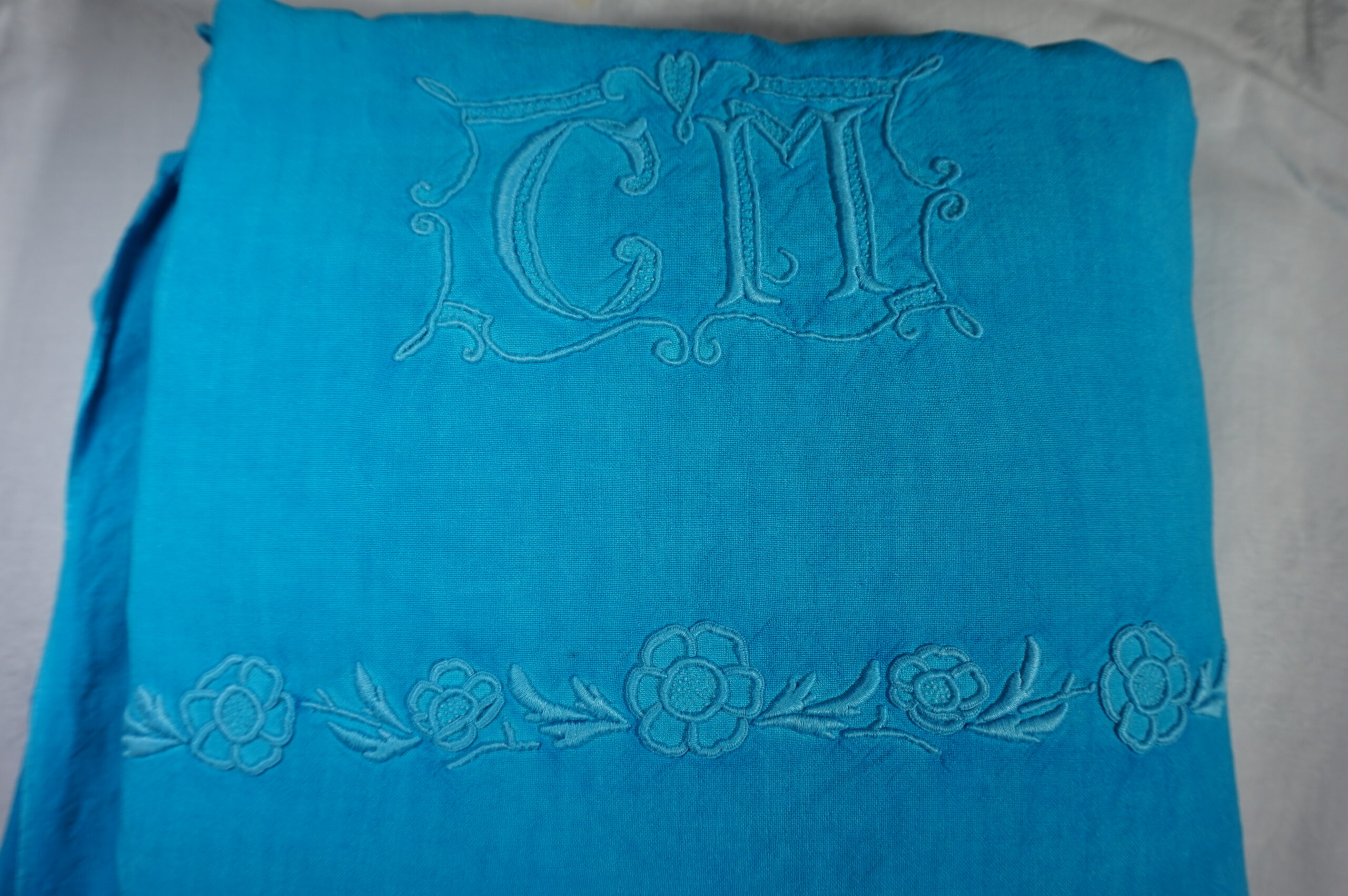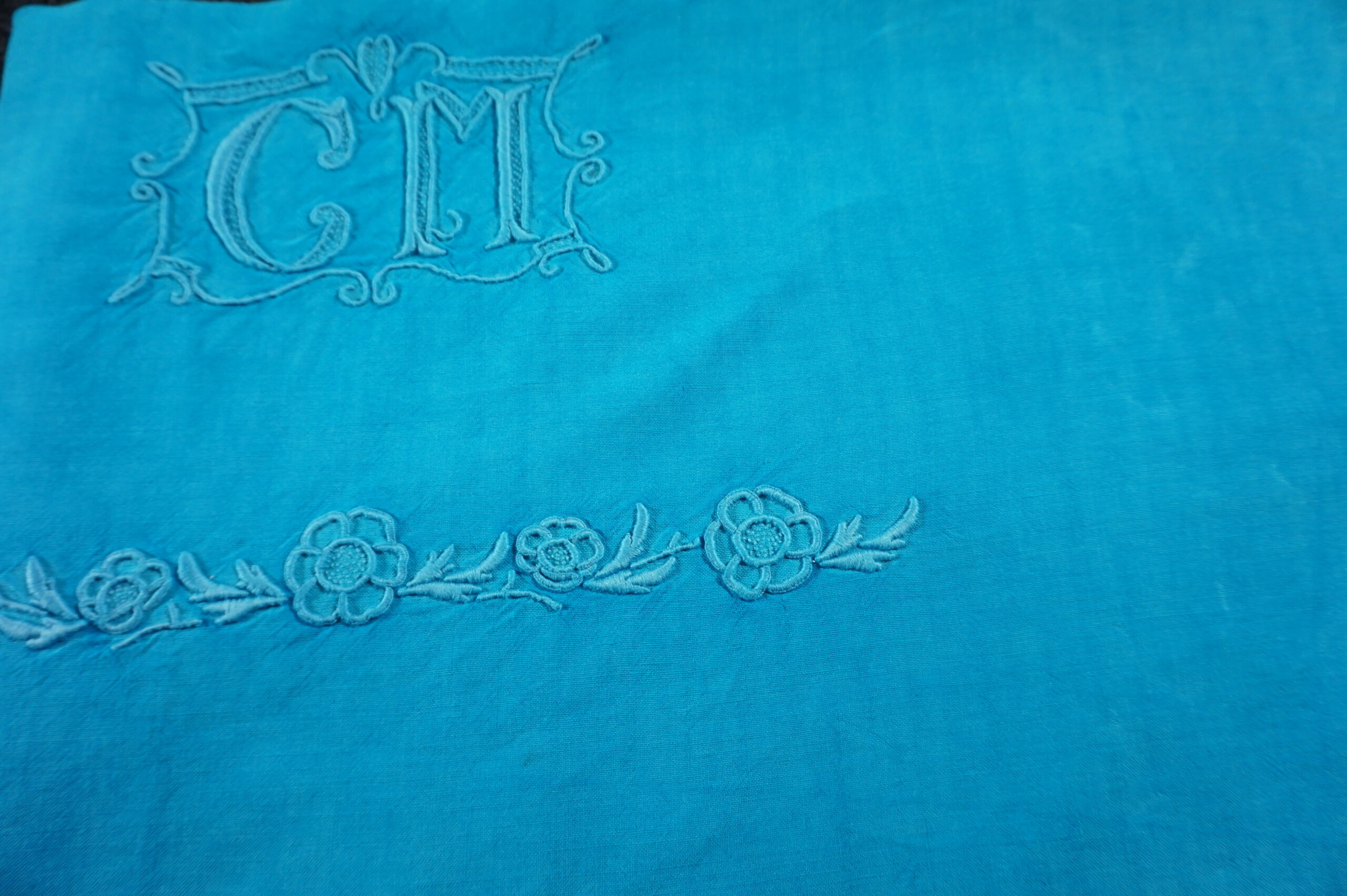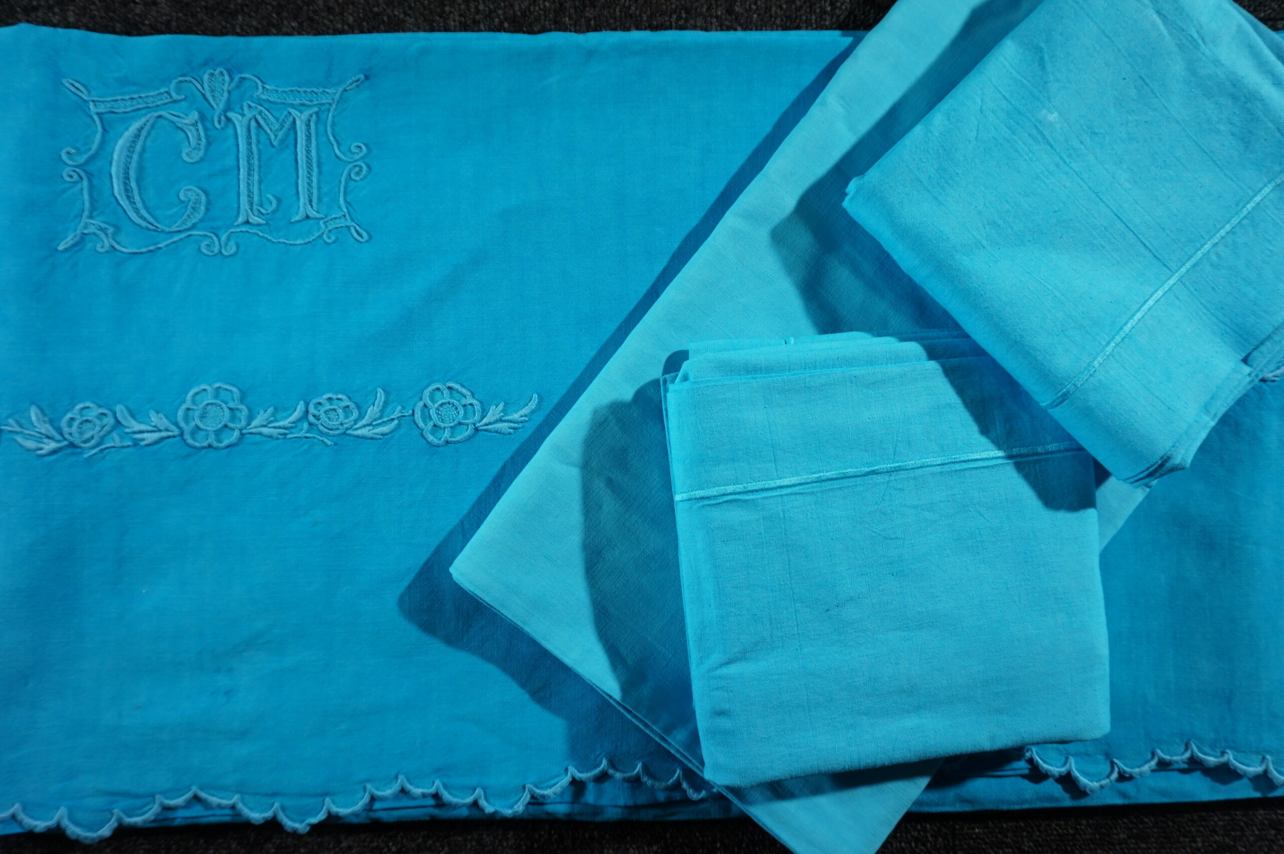 Drap et taies teints en bleu turquoise les taies sont plus claires, un petit défaut entre la broderie et le bord dû au temps passé .Produit de très belle qualité
