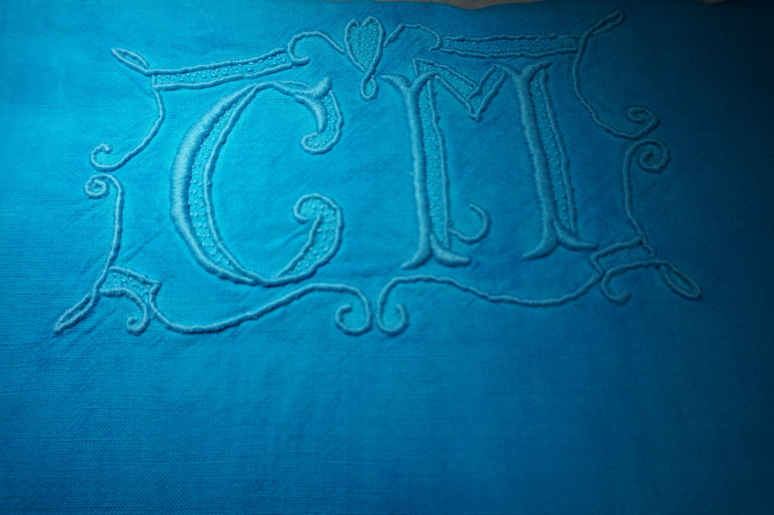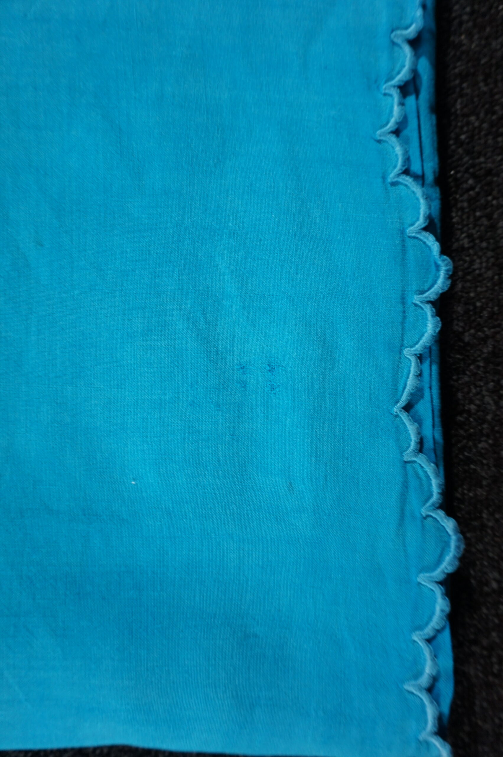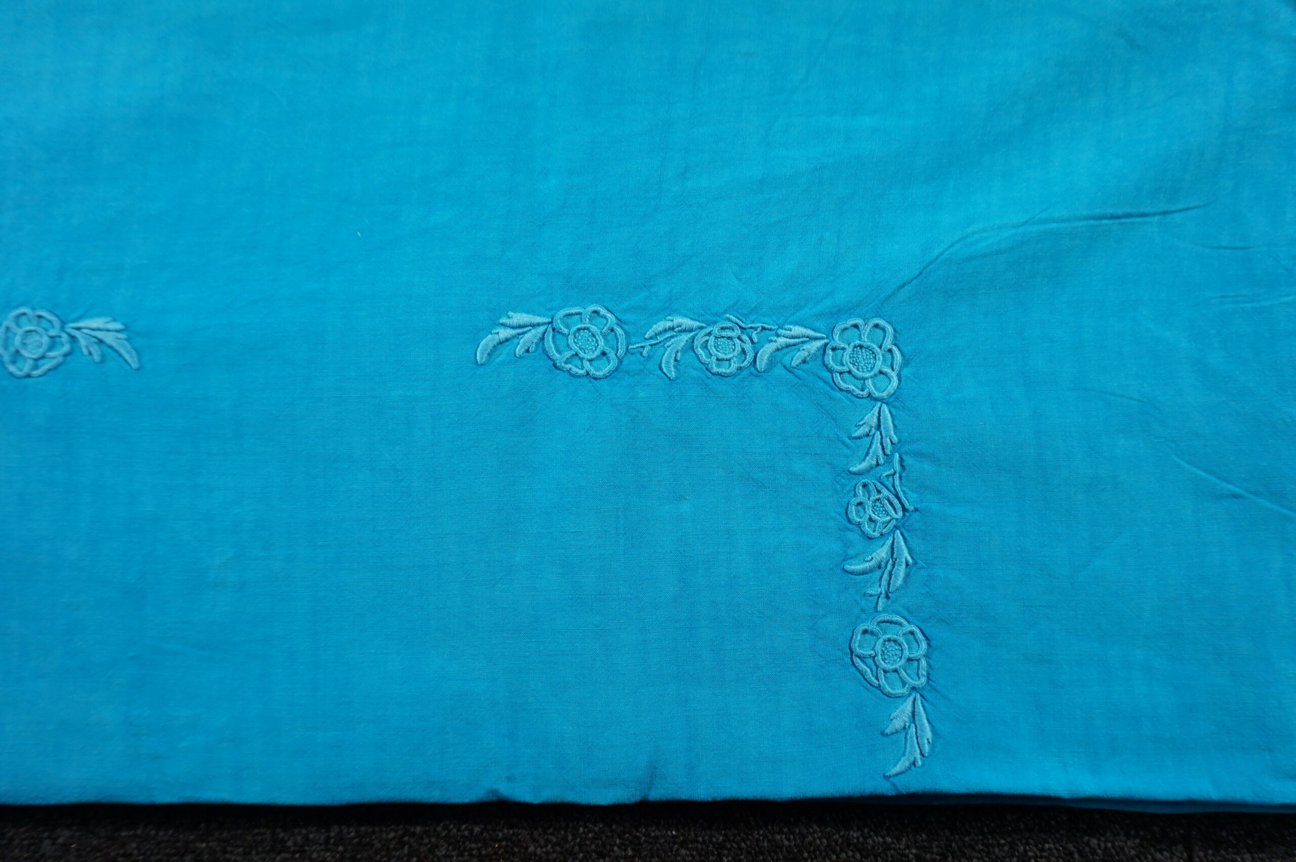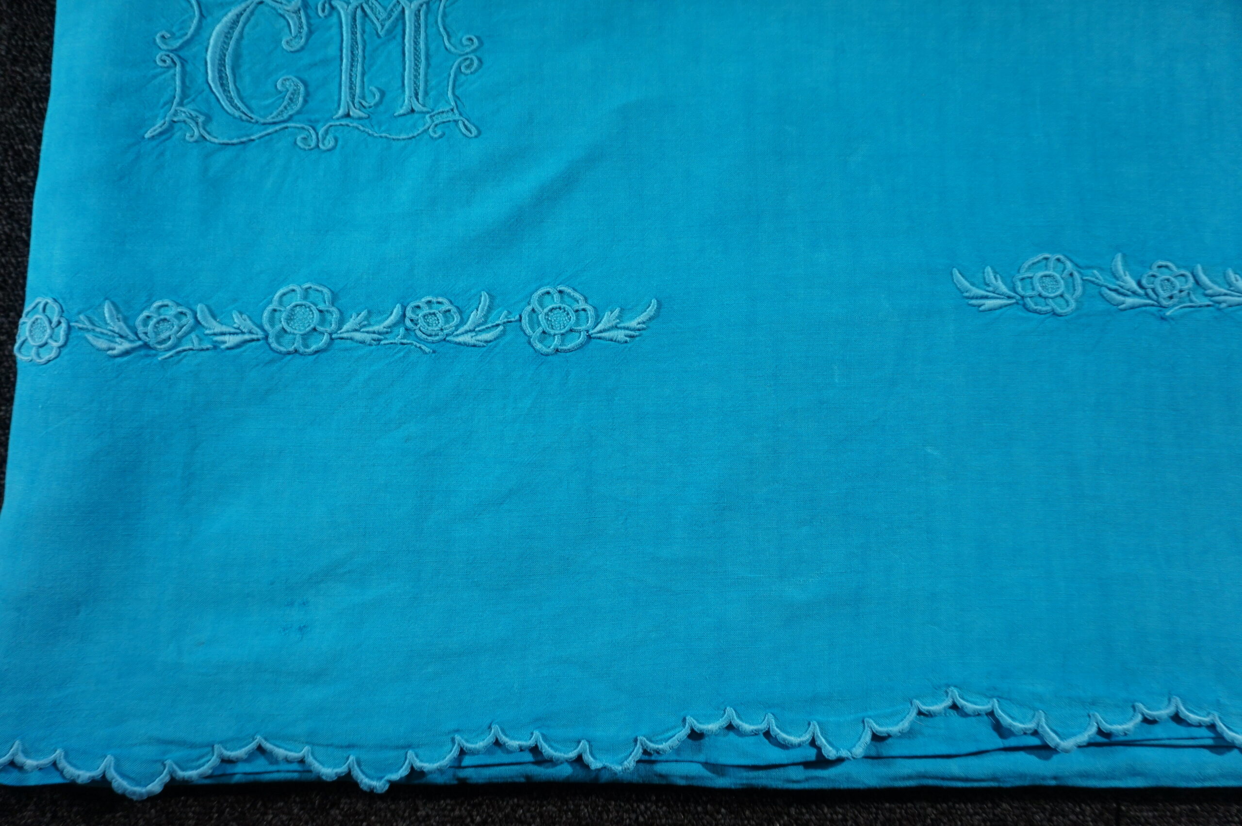 Drap et taies teints en bleu turquoise les taies sont plus claires, un petit défaut entre la broderie et le bord dû au temps passé .Produit de très belle qualité