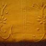 La matière, à la fois souple, dense et légèrement texturée, porte magnifiquement la couleur. La pièce a été teinte dans notre atelier dans un jaune très lumineux, une nuance solaire, vibrante, qui met en valeur la trame du tissu et lui donne une présence contemporaine tout en respectant son caractère ancien.