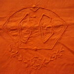 Drap ancien en lin (années 1900–1930), monogramme CG, teint dans un orange signature. Dimensions 200×300 cm, très bel état. Prix : 110 €