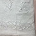 La largeur du drap est embellie d’une dentelle entièrement réalisée à la main, délicate et régulière, qui apporte une touche de raffinement rare. Le drap est également orné d’un monogramme ST, brodé avec un travail fin, en relief, témoignant d’un savoir‑faire artisanal soigné et d’une grande attention portée au linge familial.