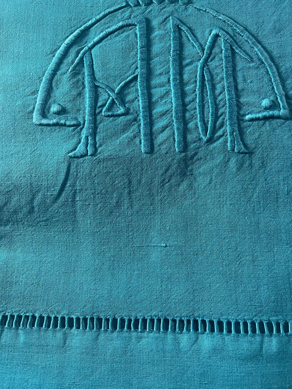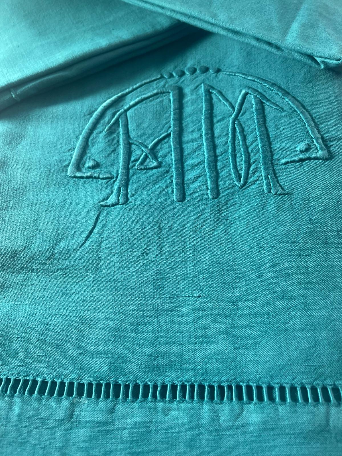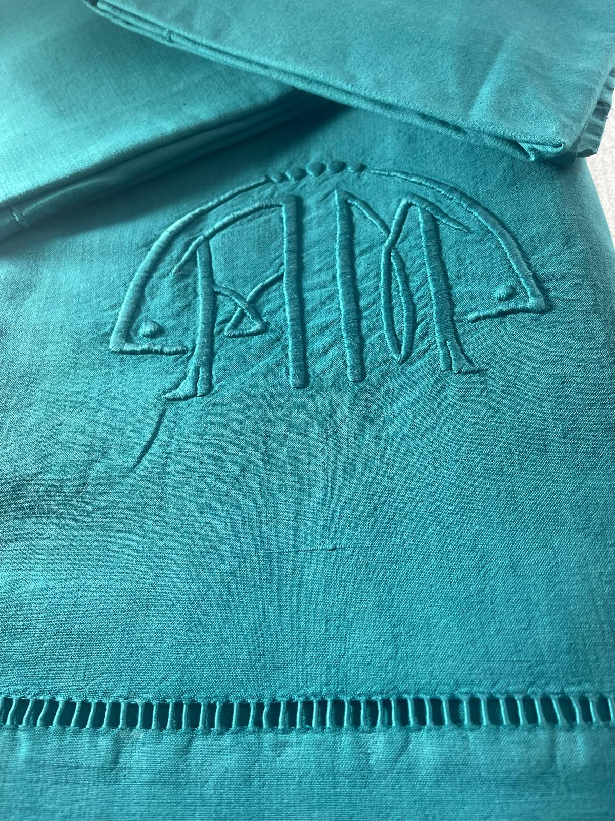 Drap émeraude 200/320 avec 2 taies d’oreiller 50/60, monogramme AM