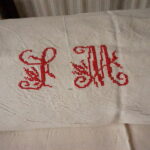 Magnifique drap ancien couleur sable, brodé d’un monogramme SM en rouge, offrant un contraste délicat et raffiné. Ses dimensions généreuses 180 × 270 cm en font une pièce élégante, idéale pour un lit double ou en dessus‑de‑lit léger.