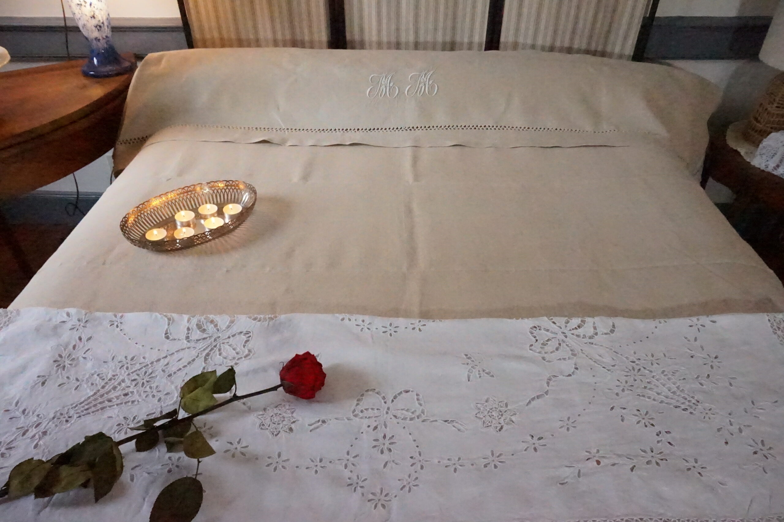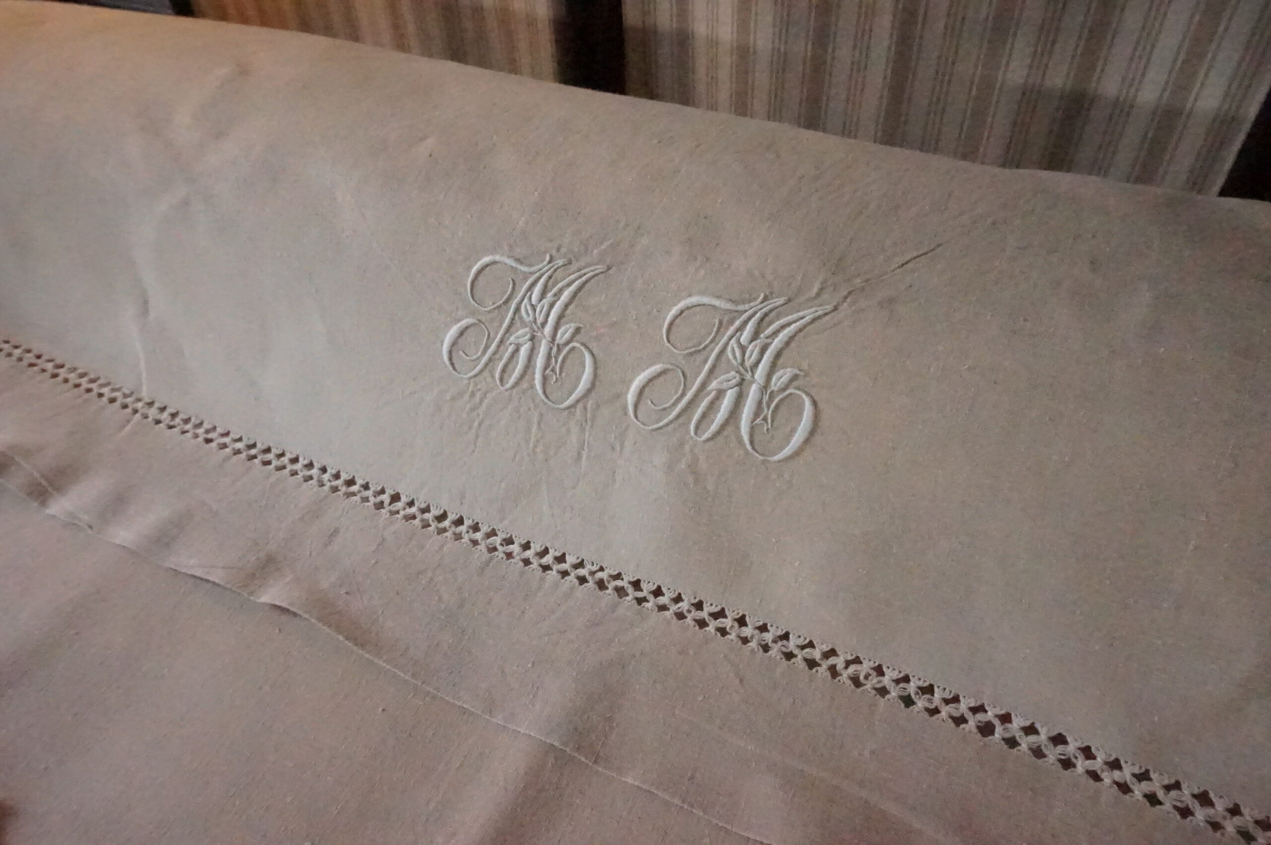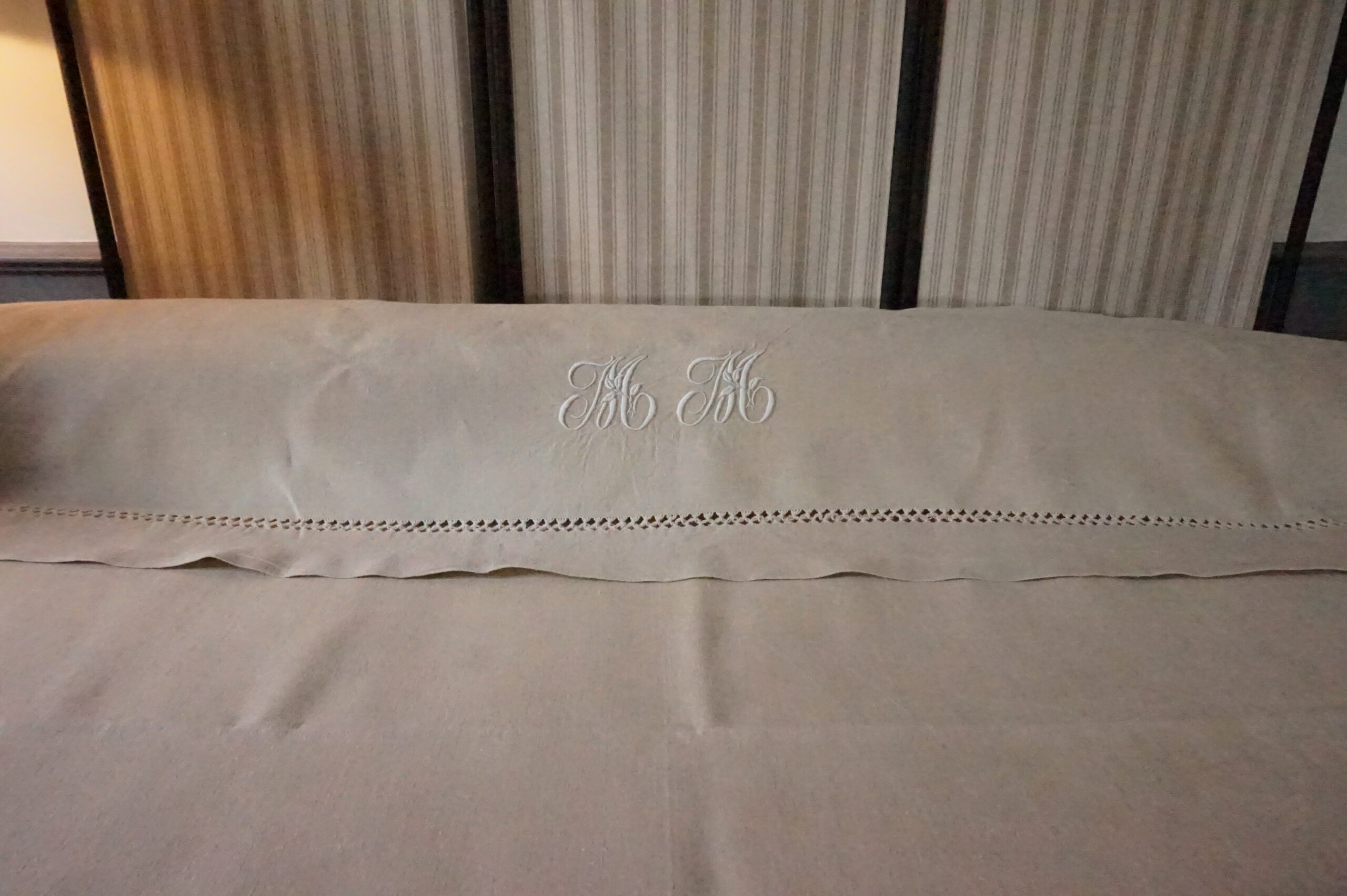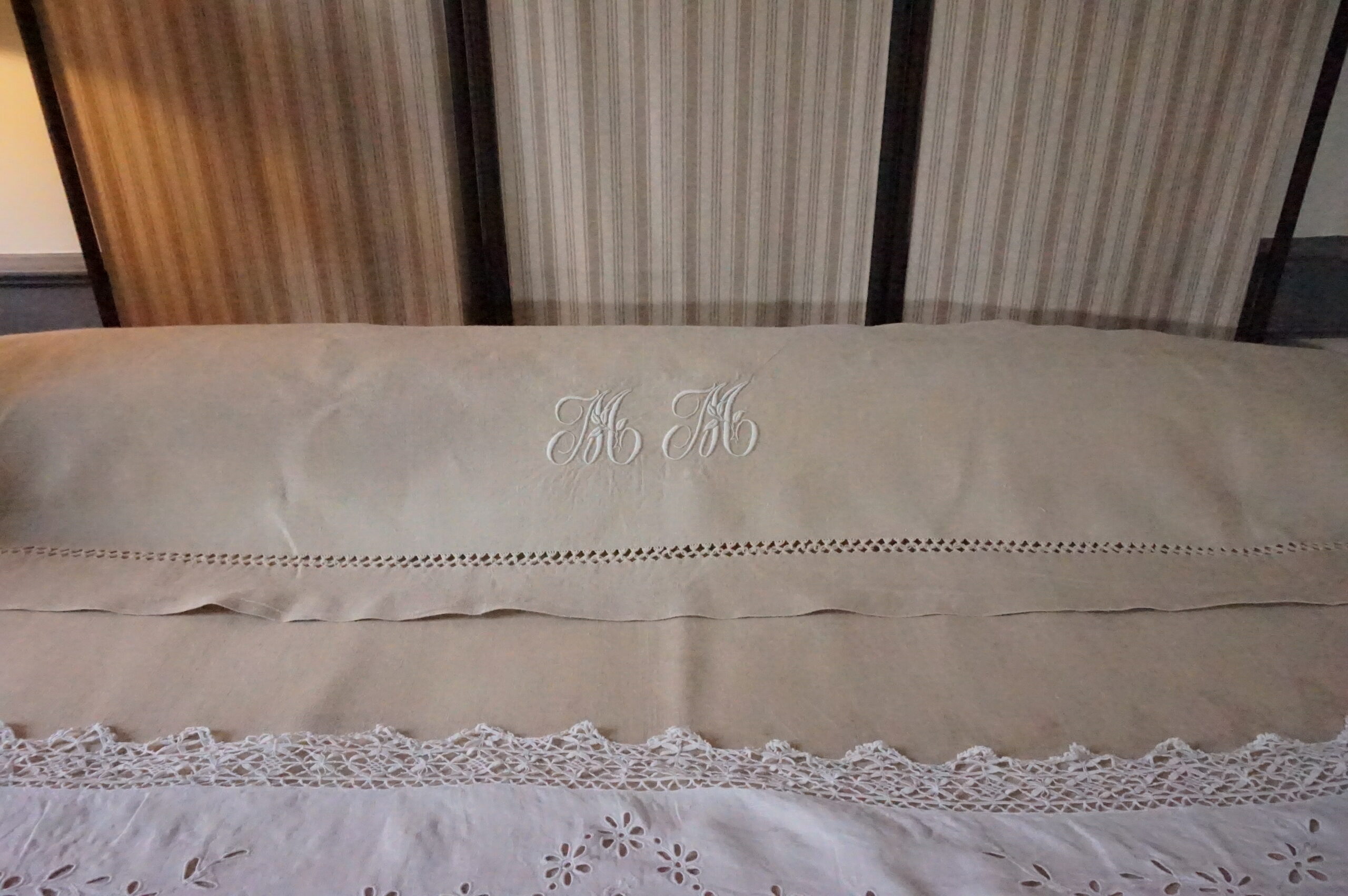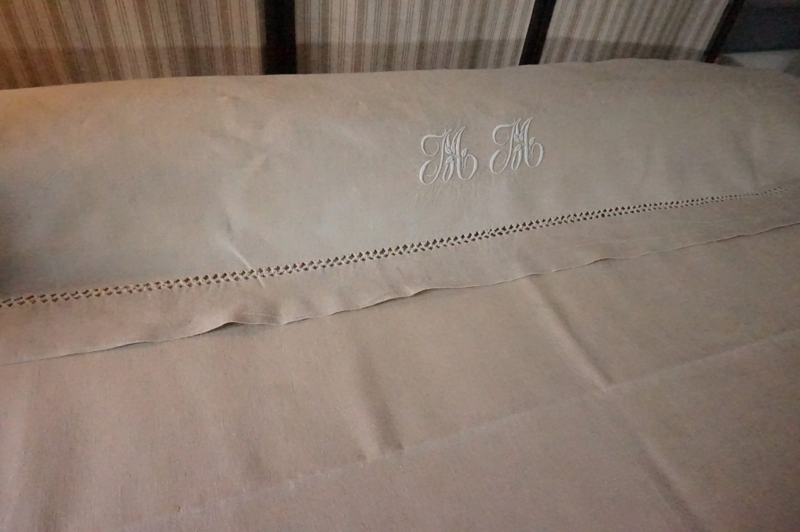 Très joli drap sable, monogrammé MM, de couleur sable, bordure avec un jour de Venise, dimensions 200/240, jamais utilisé, lavé et désinfecté par nos soins.