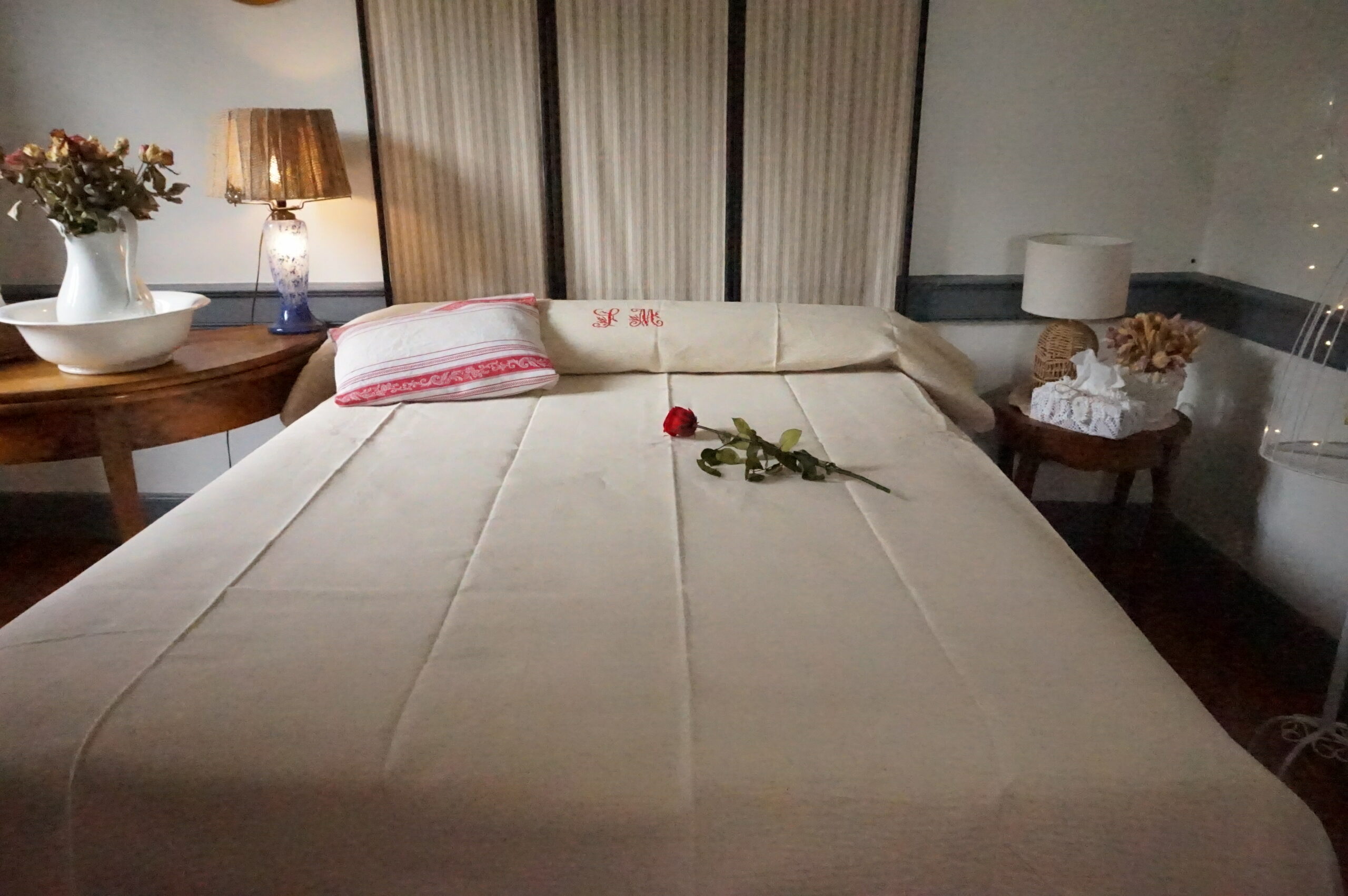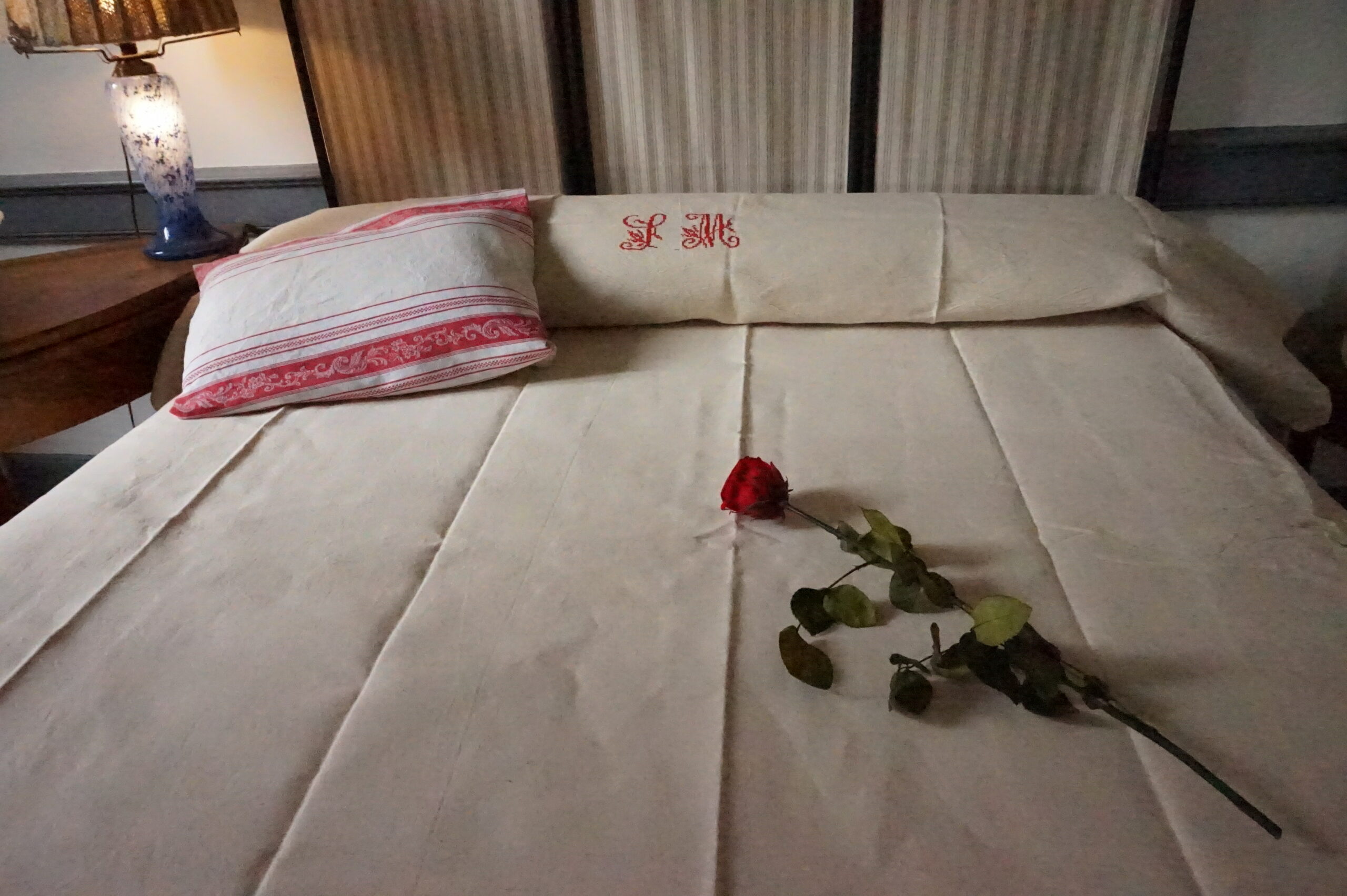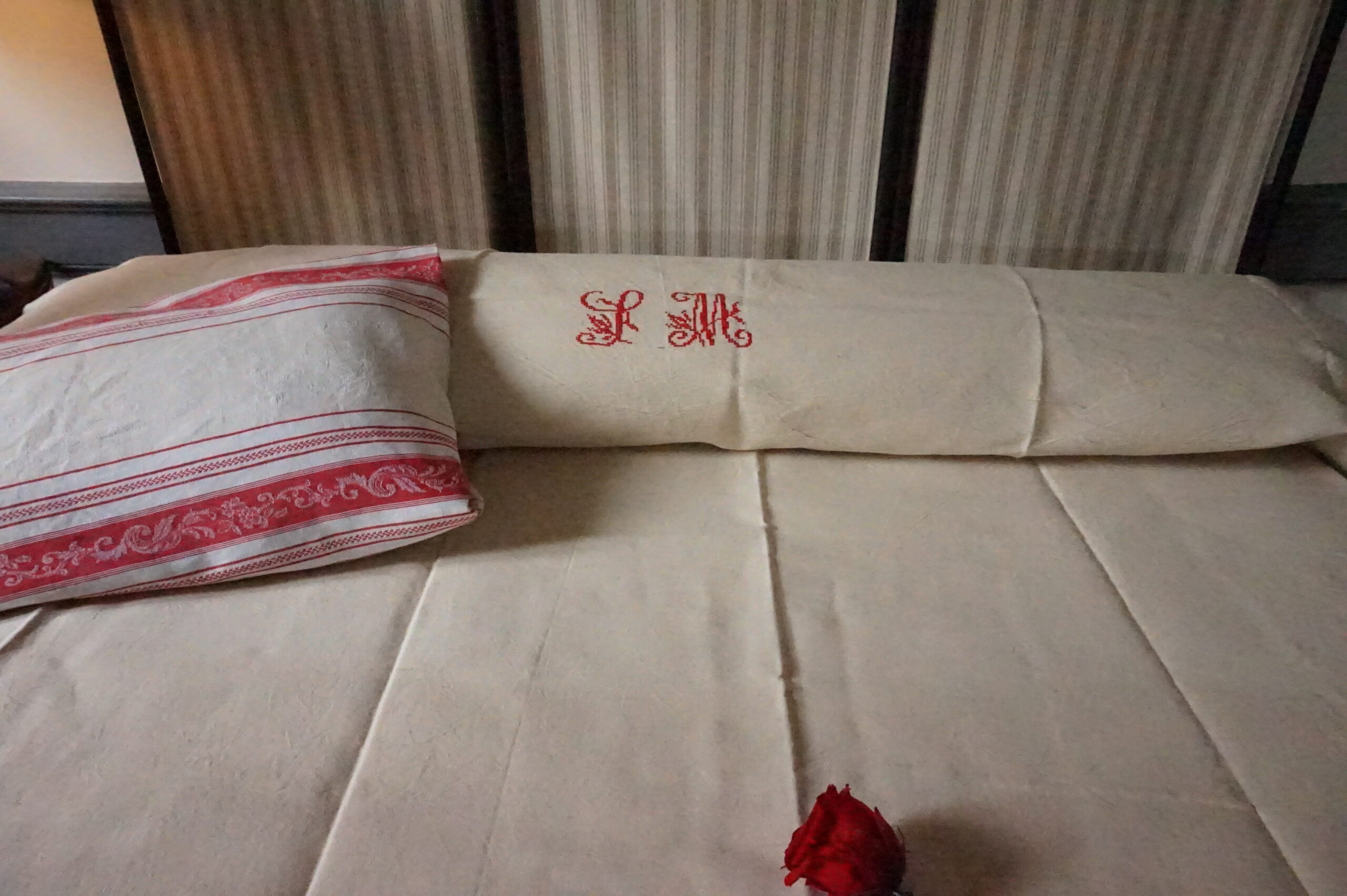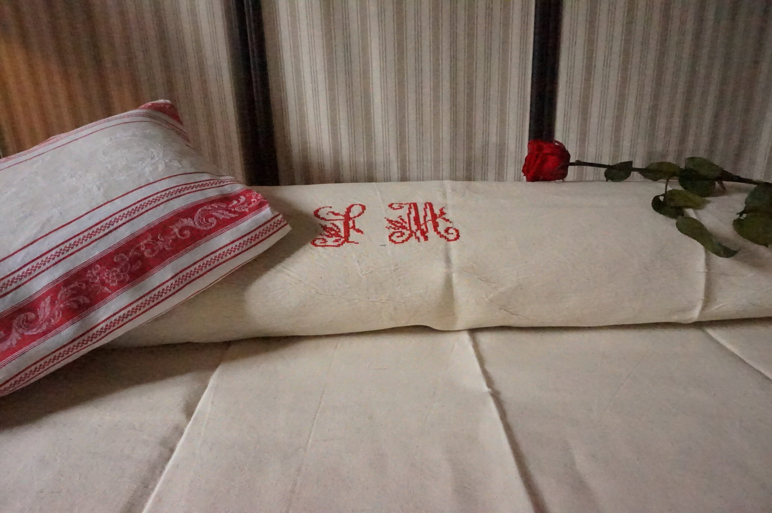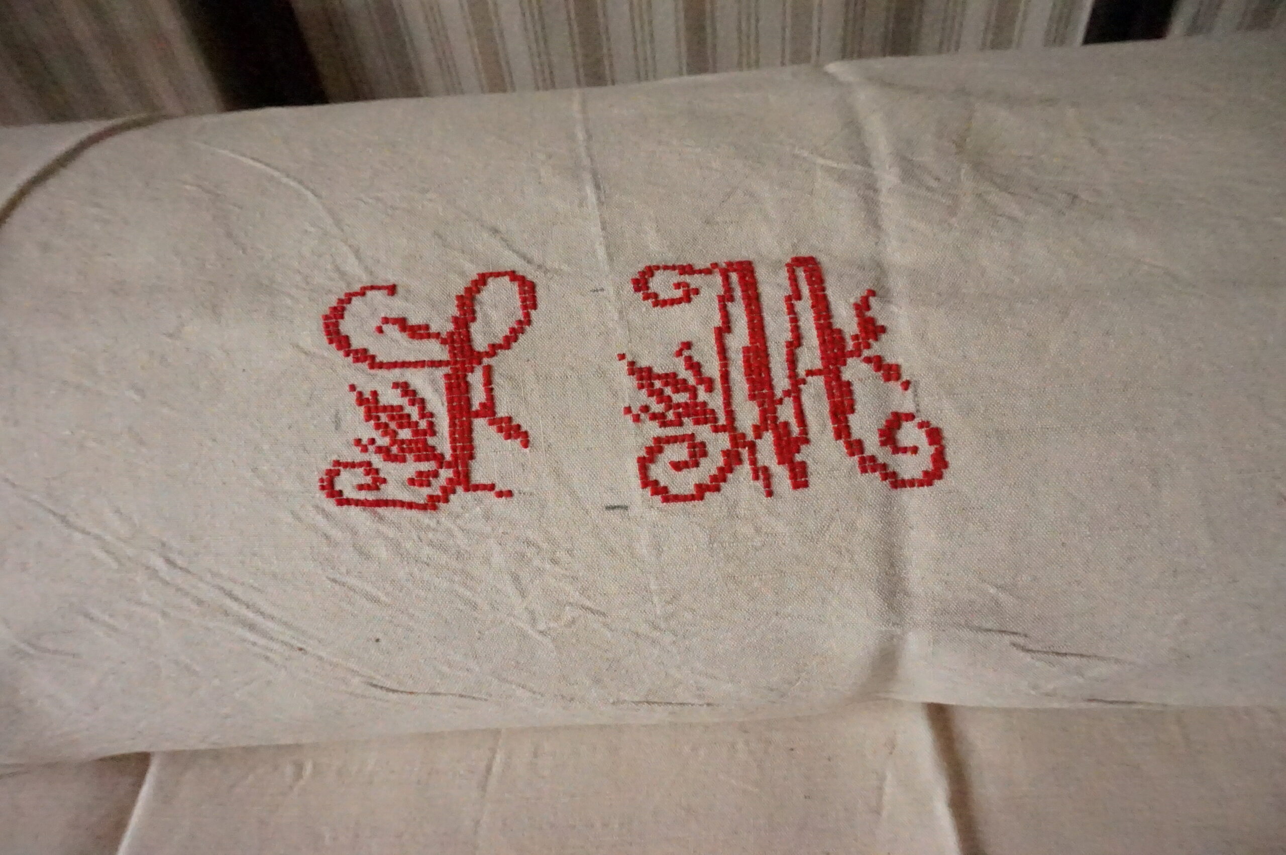 Magnifique drap monogrammé SM en rouge, couleur sable, de dimensions 180/270 ,sorti de l’armoire , lavé une seule fois par mes soins.