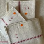 Lot de 5 torchons anciens épais à rayures rouges. Format 53×96 cm. Quelques petites taches signalées. Datation : années 1940–1960. Linge solide, propre et prêt à l’usage.