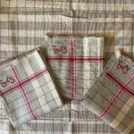 Magnifique lot de 4 torchons brodés EF – carreaux écru, gris et rouge – 65×80 cm