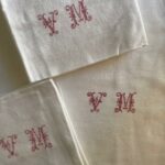 Chaque pièce est brodée des initiales VM, réalisées au point de croix rouge, une broderie traditionnelle pleine de caractère. L’ensemble dégage un charme authentique, typique des trousseaux familiaux du milieu du XXᵉ siècle, où l’on associait damassé fin et broderies colorées.