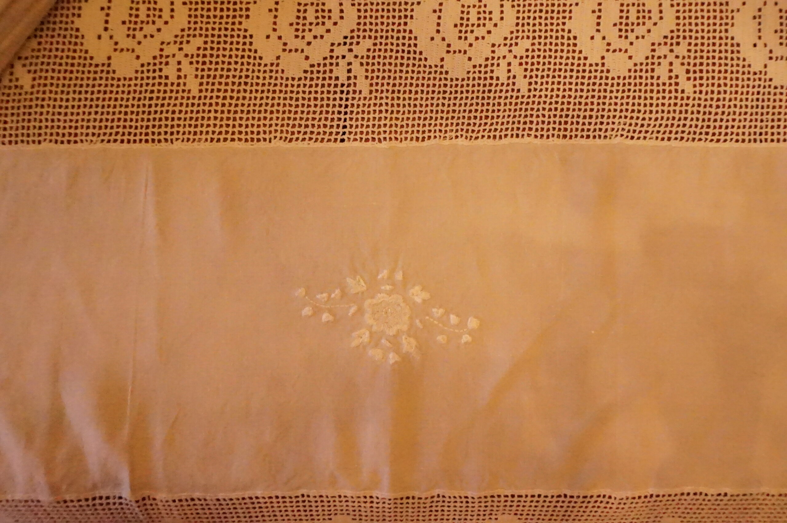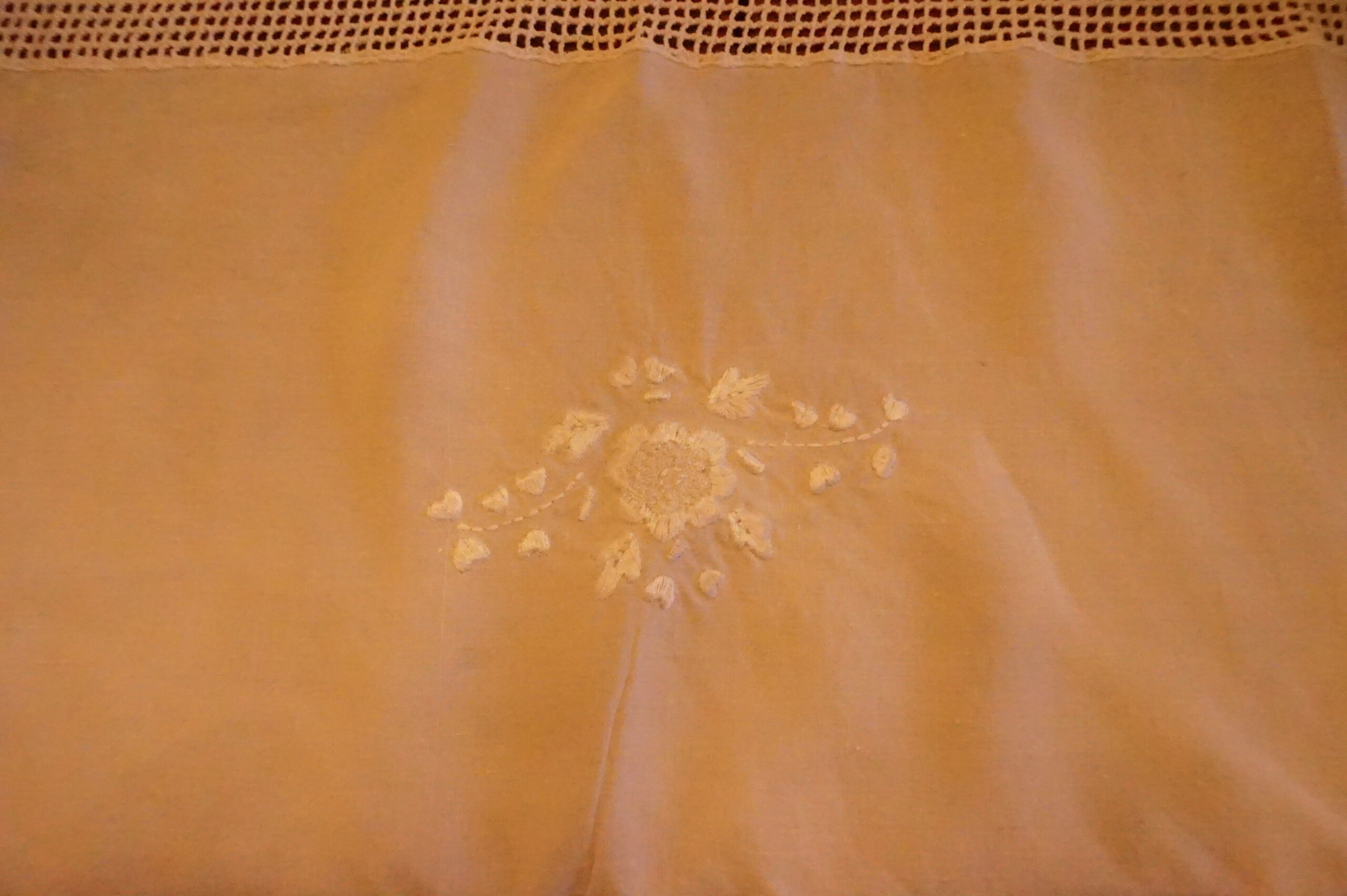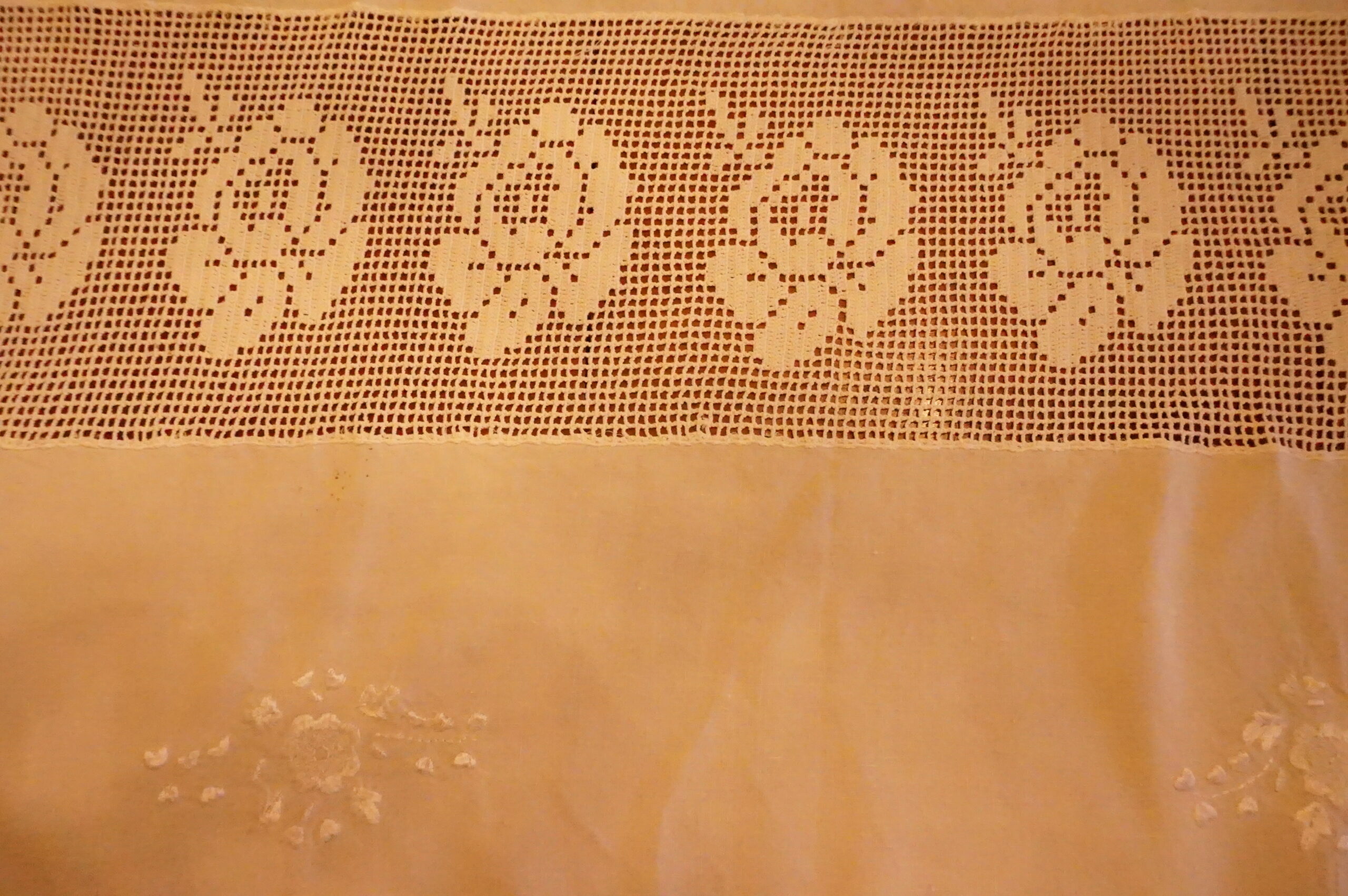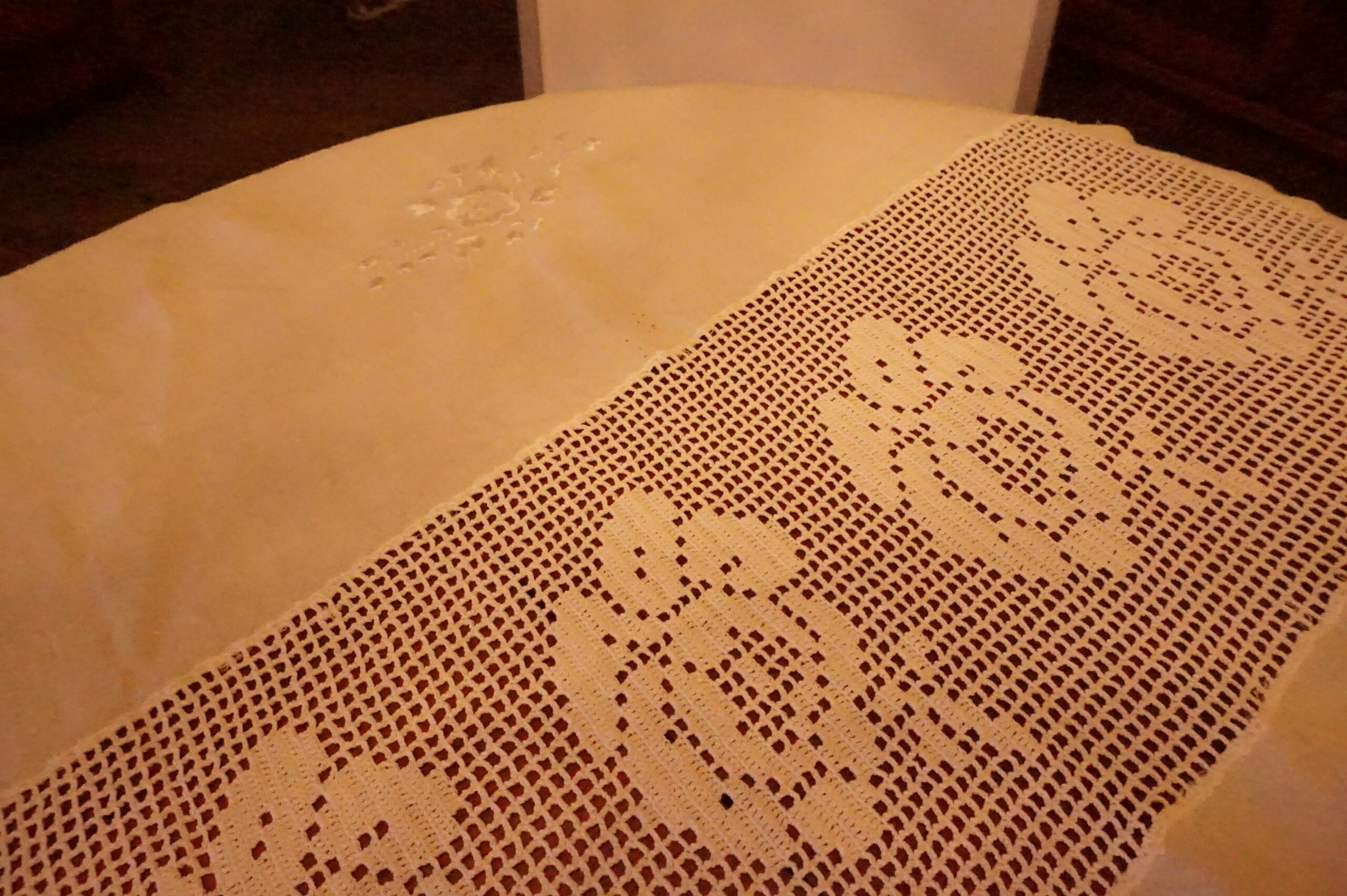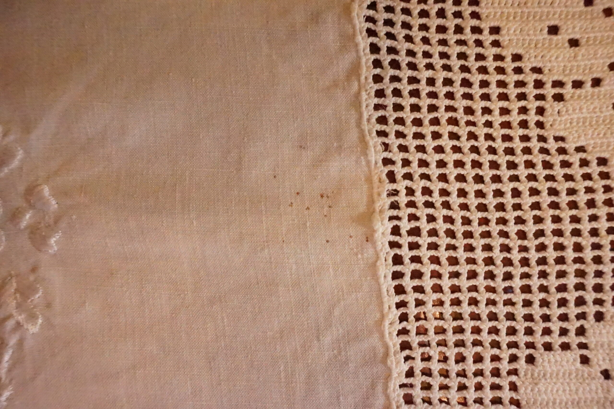 Nappe délicate, un peu bohème, en lin et crochet, toutes petites taches sans importance et très peu visibles.