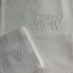 Chaque serviette est embellie d’un monogramme TW, très beau et finement brodé, qui témoigne du soin apporté au linge familial et du savoir‑faire artisanal. Les serviettes présentent quelques légères taches, discrètes, qui n’enlèvent rien à leur charme ni à leur usage.