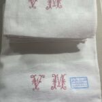 Chaque serviette est embellie d’un monogramme VM brodé en rouge, au point de croix, un détail précieux qui témoigne du soin apporté au linge familial et du savoir‑faire artisanal. L’ensemble est lavé, prêt à l’usage, et présente un très bel état général.
