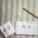 Le damassé, lumineux et délicatement tissé, crée de beaux jeux de lumière et apporte une présence raffinée, typique du linge de maison d’autrefois. Chaque serviette est embellie d’un monogramme MS brodé en rouge, dans un travail fleuri très soigné, qui témoigne du savoir‑faire artisanal et de l’attention portée au linge familial.