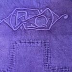 Nappe damassée violette 150×230 cm, ajourée autour du monogramme AQ, avec 11 serviettes brodées assorties. Ensemble élégant et généreux.