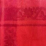 Nappe damassée teintée rouge 150×200 cm, accompagnée de 5 serviettes brodées PF 60×80 cm. Ensemble chaleureux et élégant.