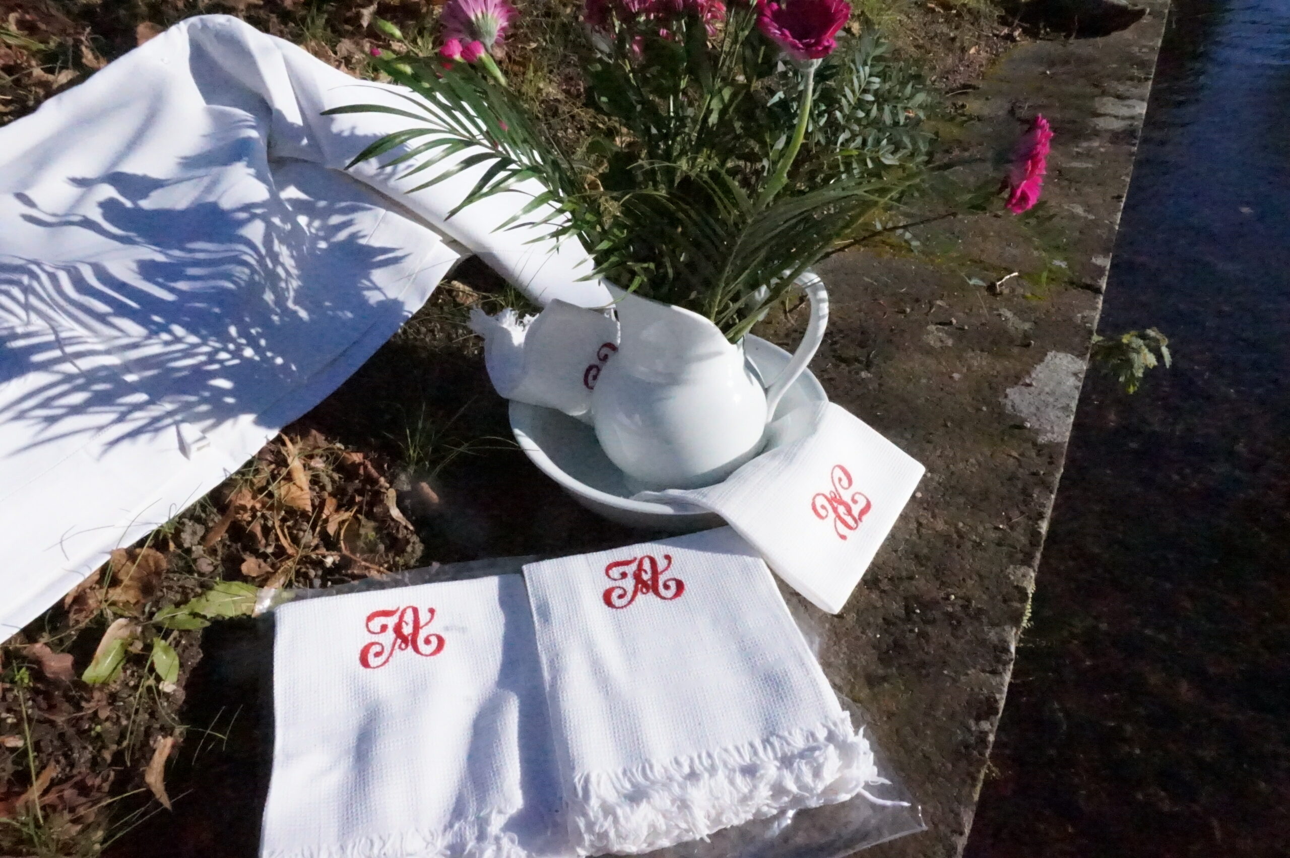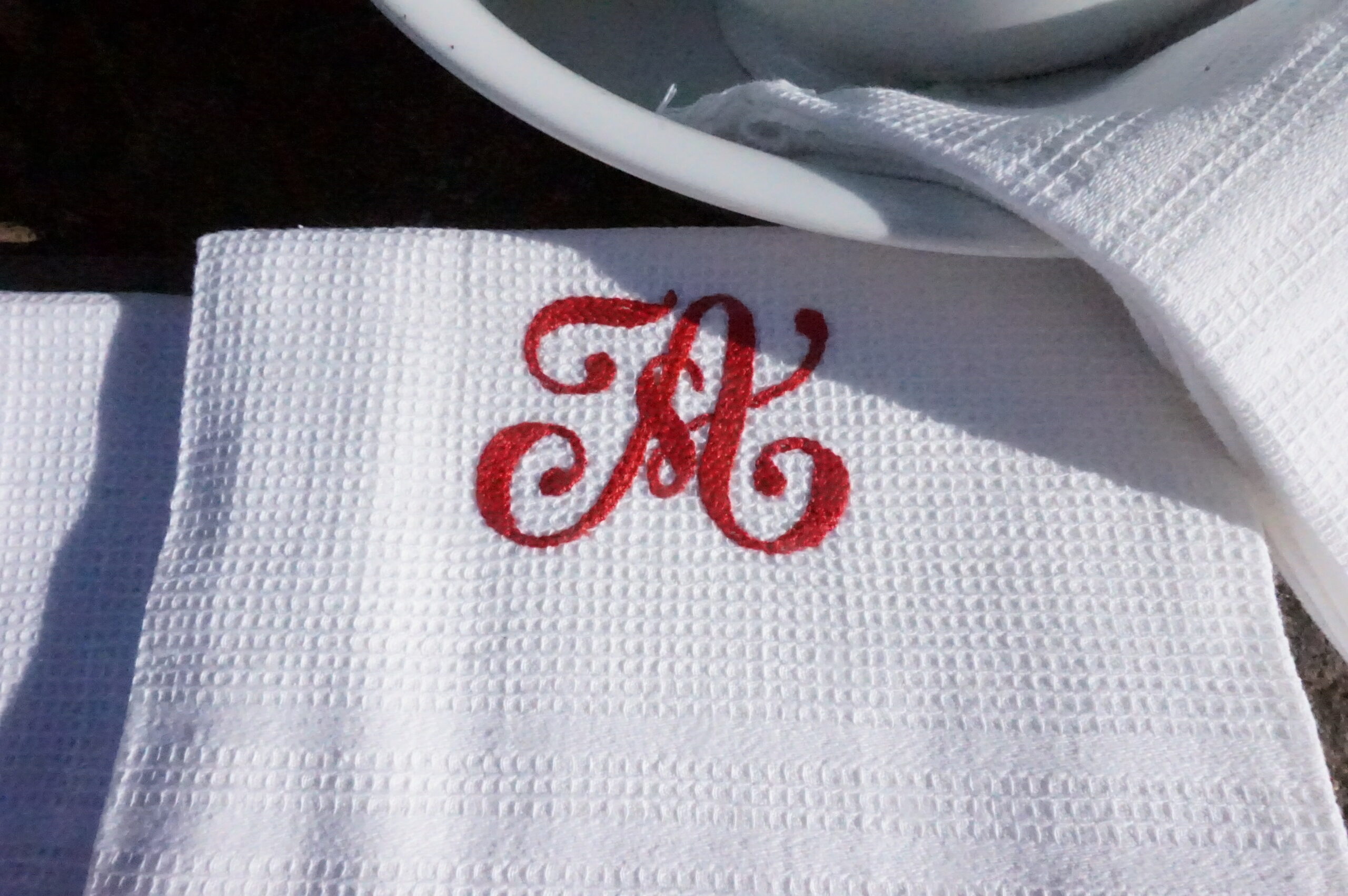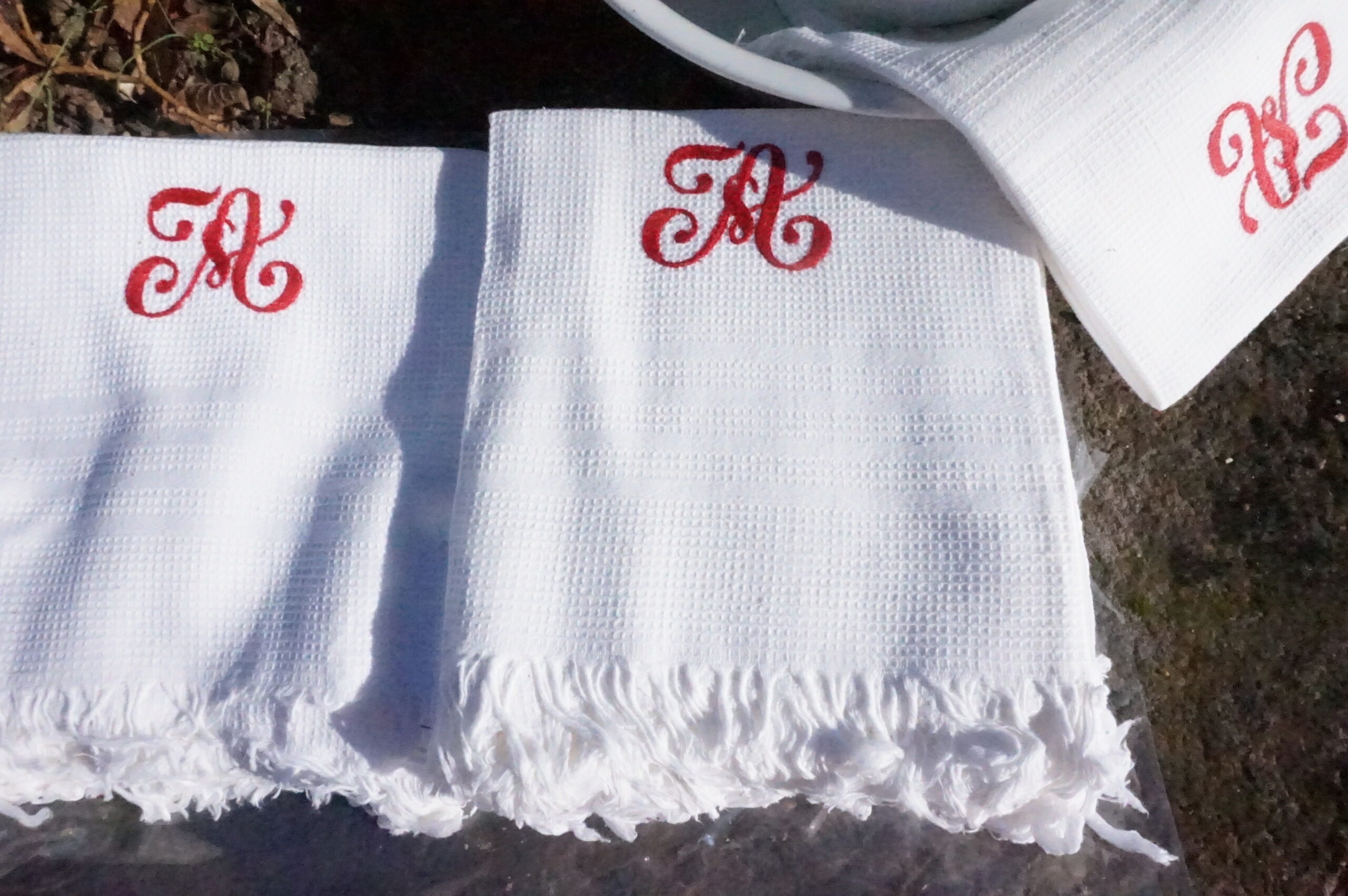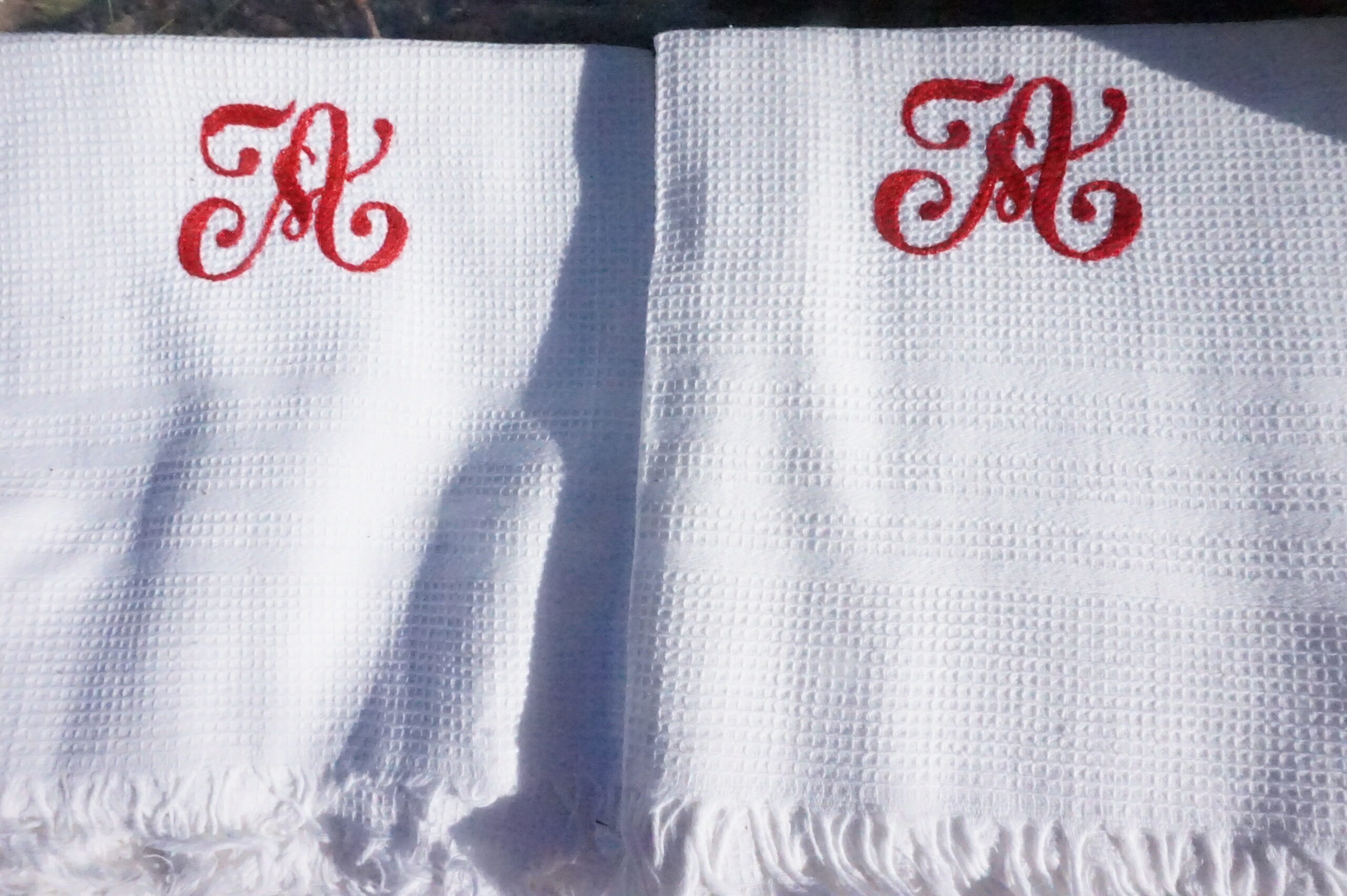 Magnifique lot de 10 serviettes de bain, nid d’abeilles, brodées A, dimensions 60/85cm, bordures à franges délicates.