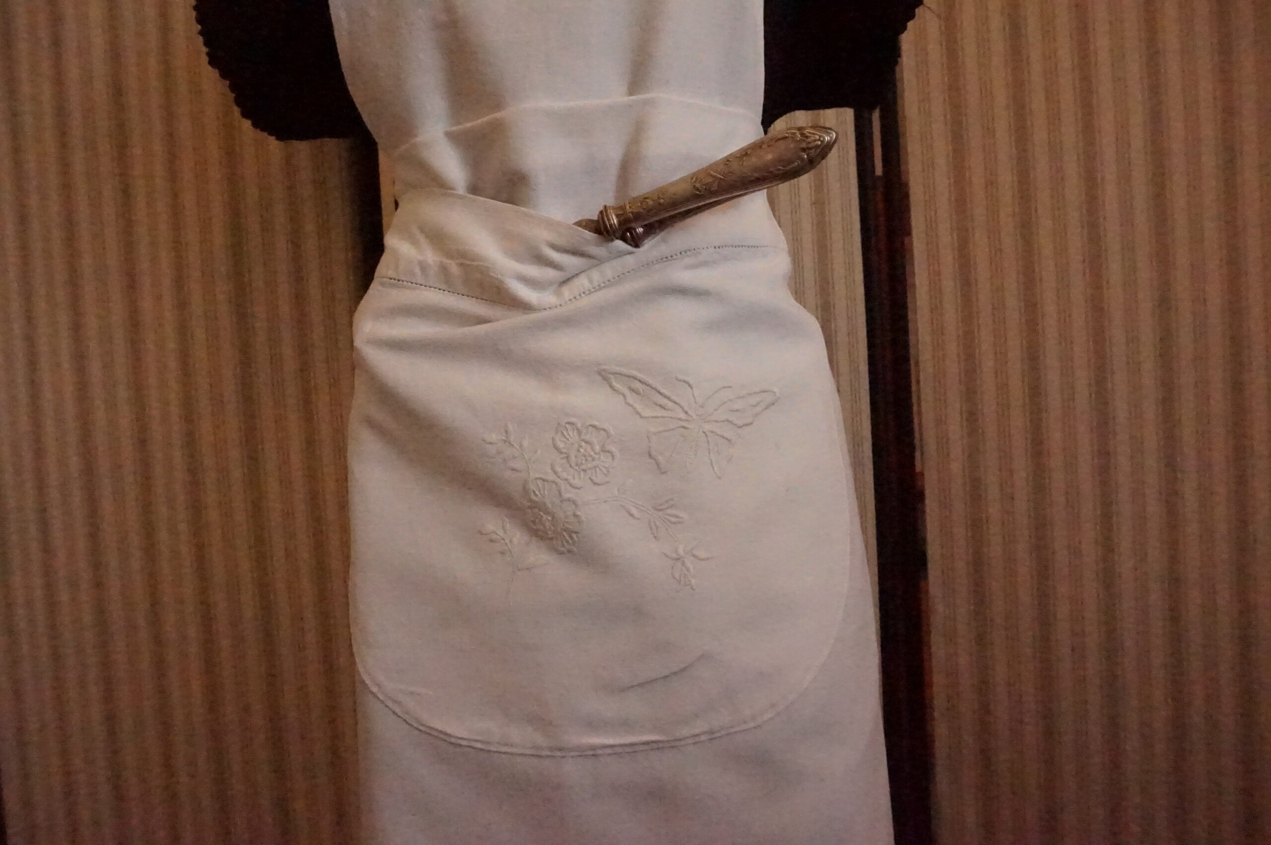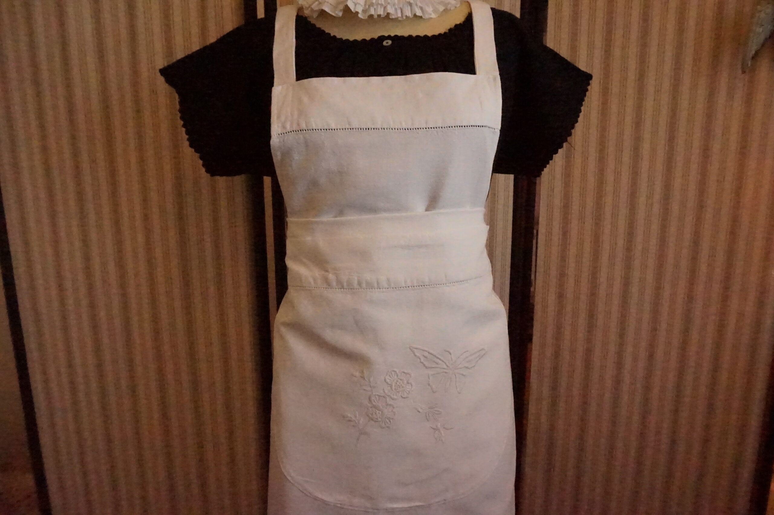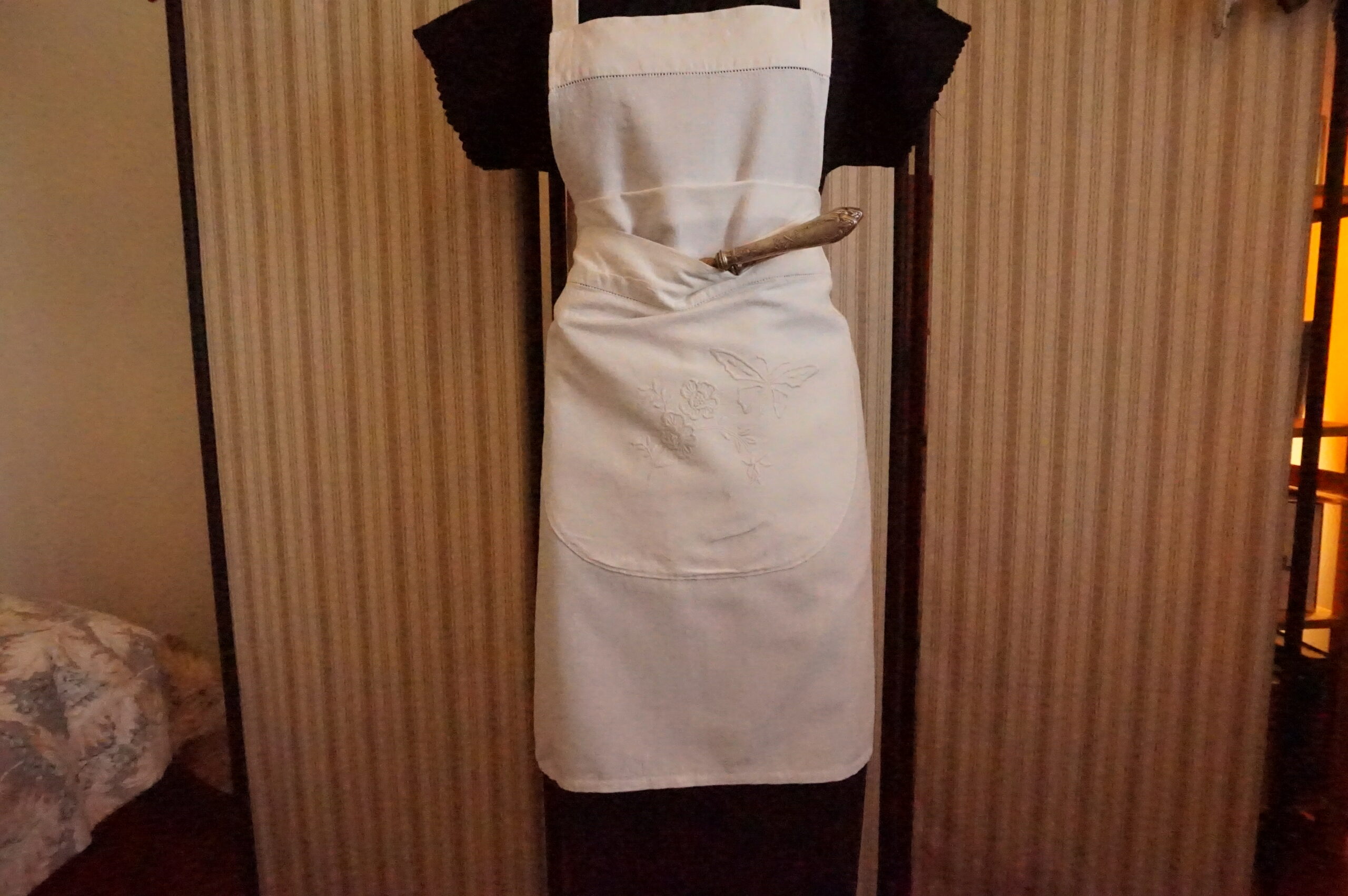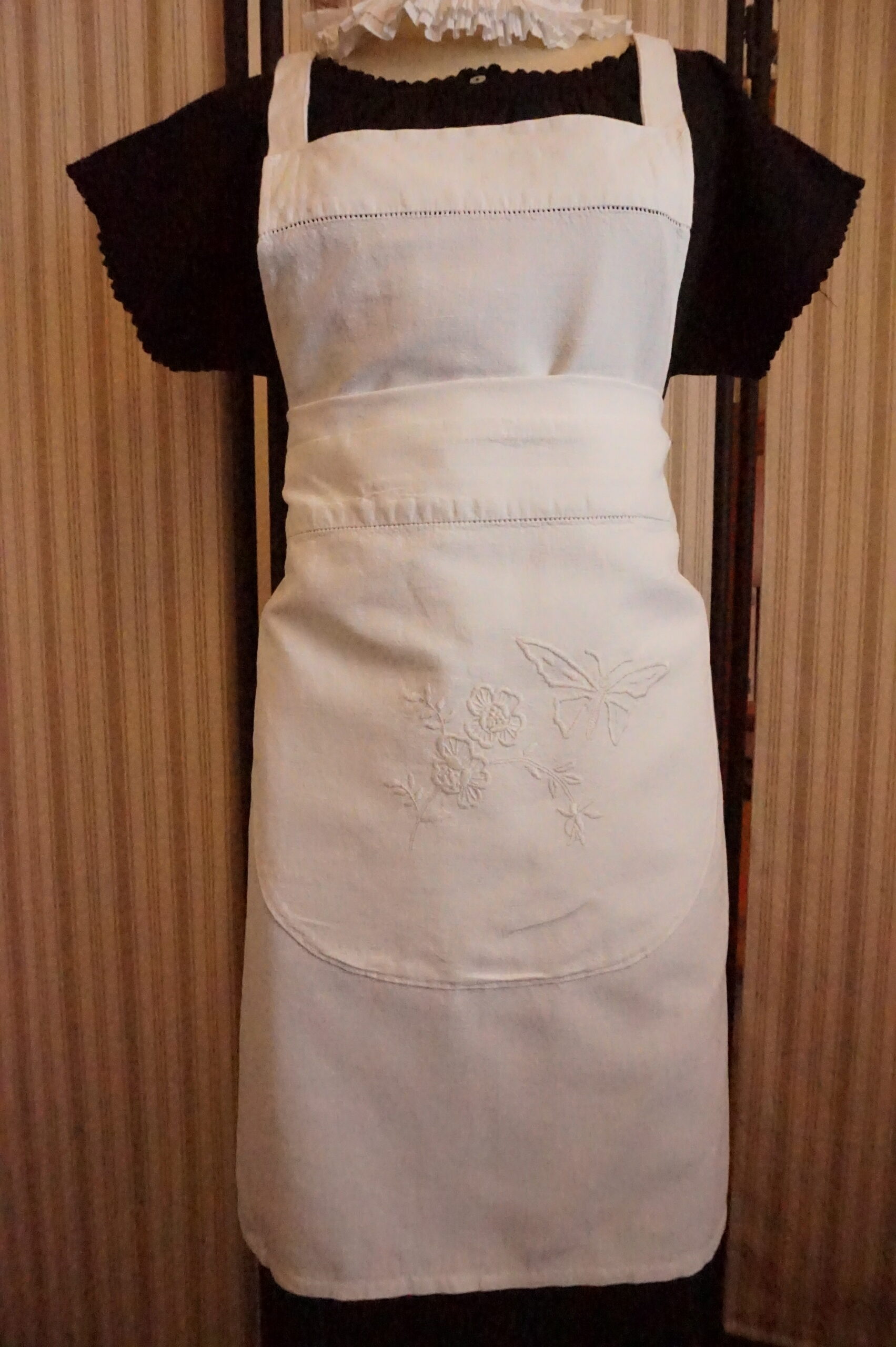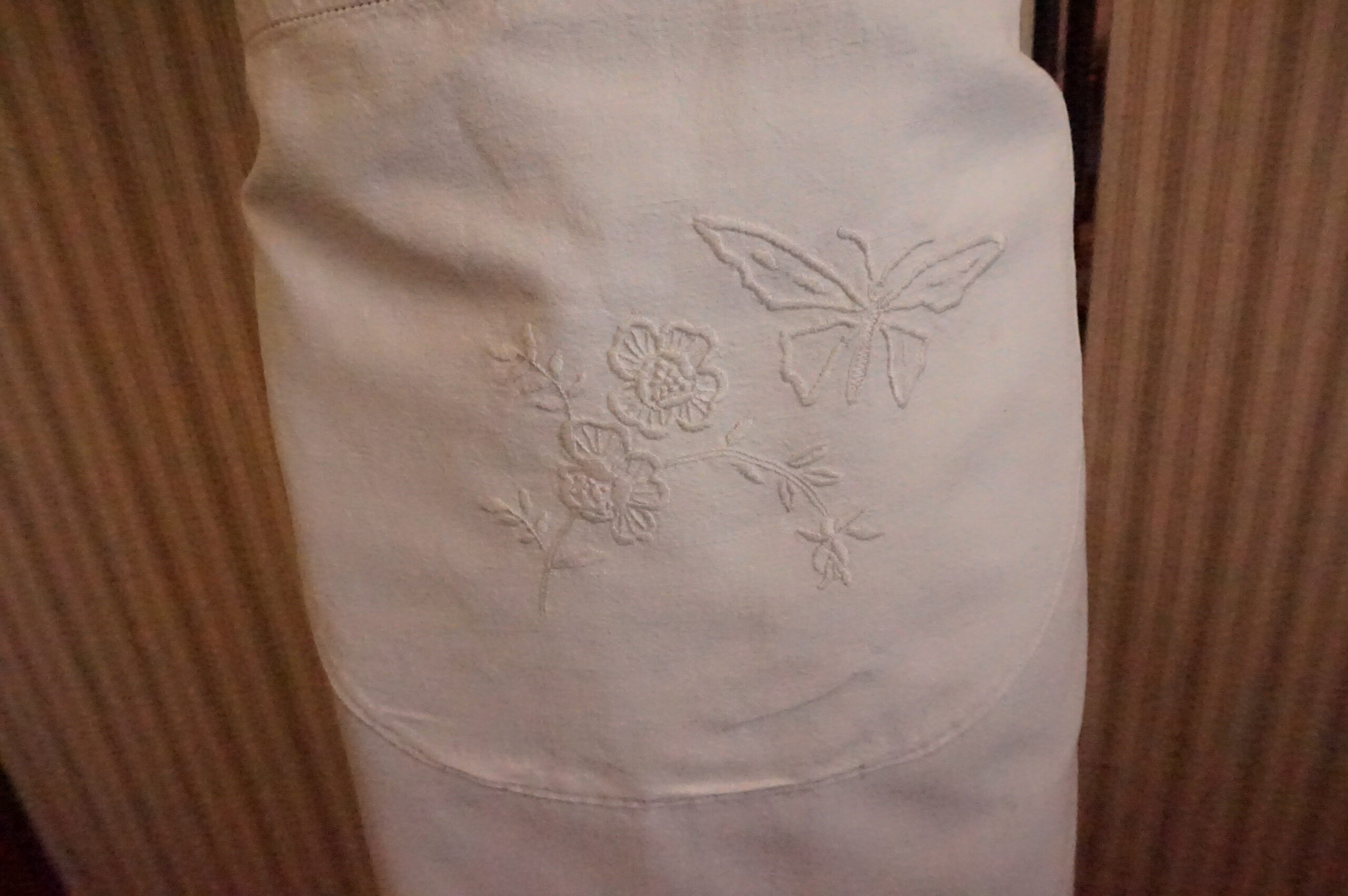 Tablier à bavette brodé sur sa grande poche centrale, création unique en recyclage de chute de draps.