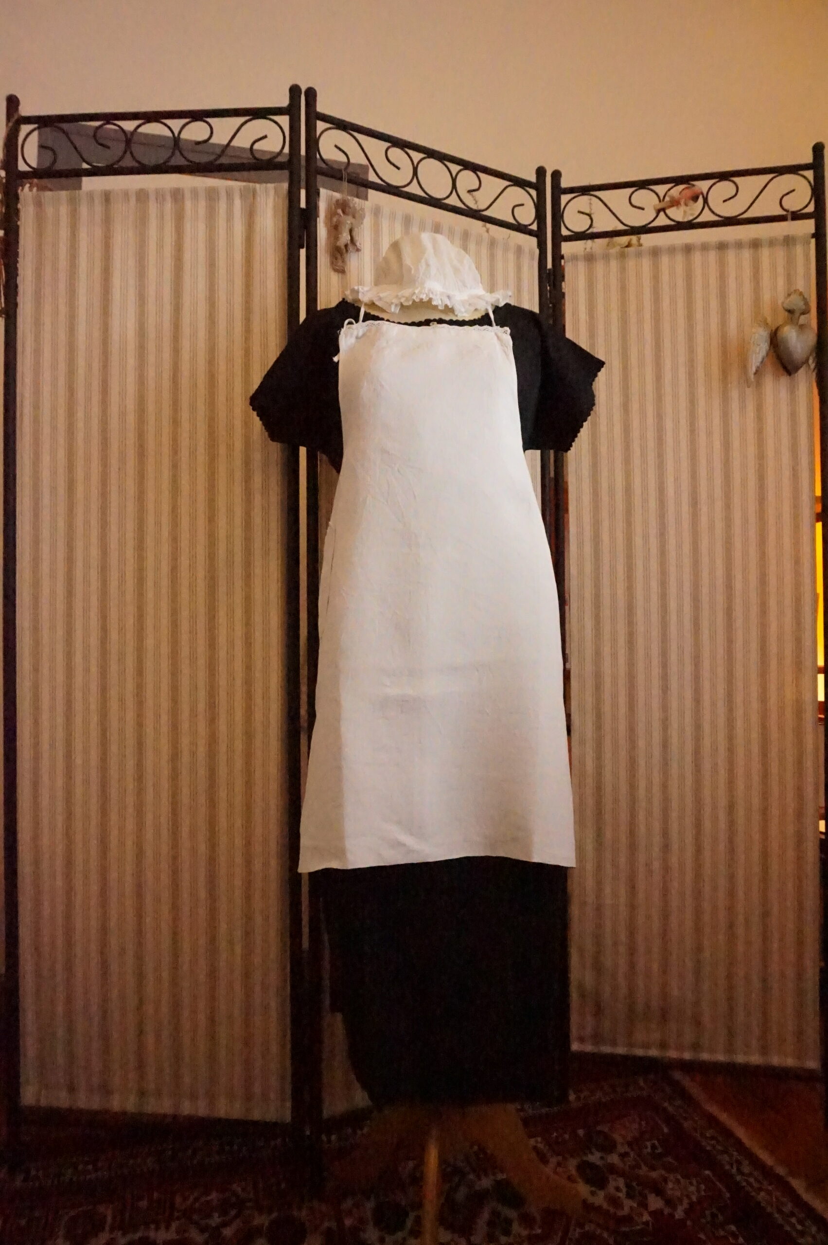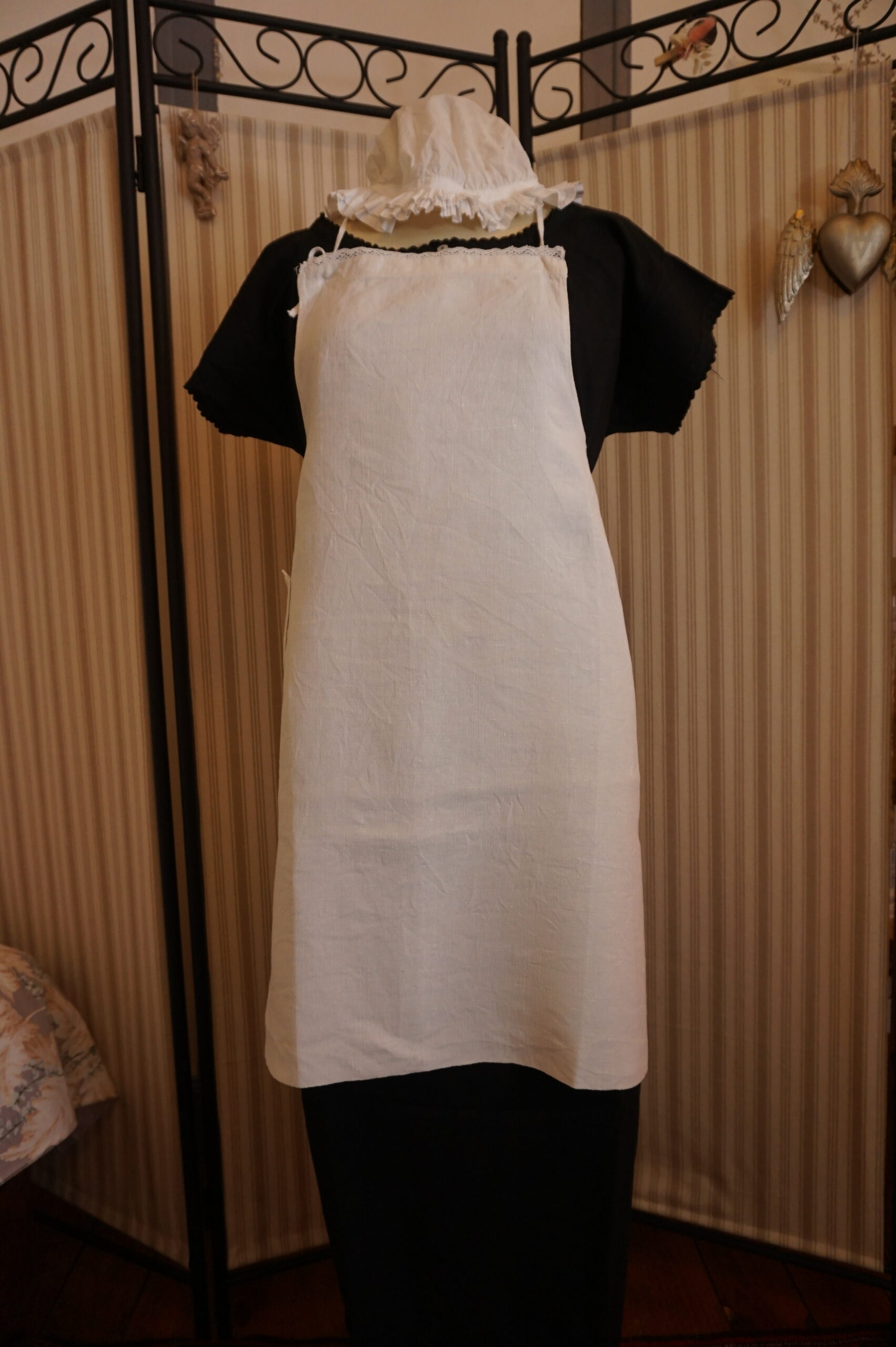 Magnifique tablier à bavette , bordure dentelle, en chanvre de petite taille , avec une petite poche sur un coté