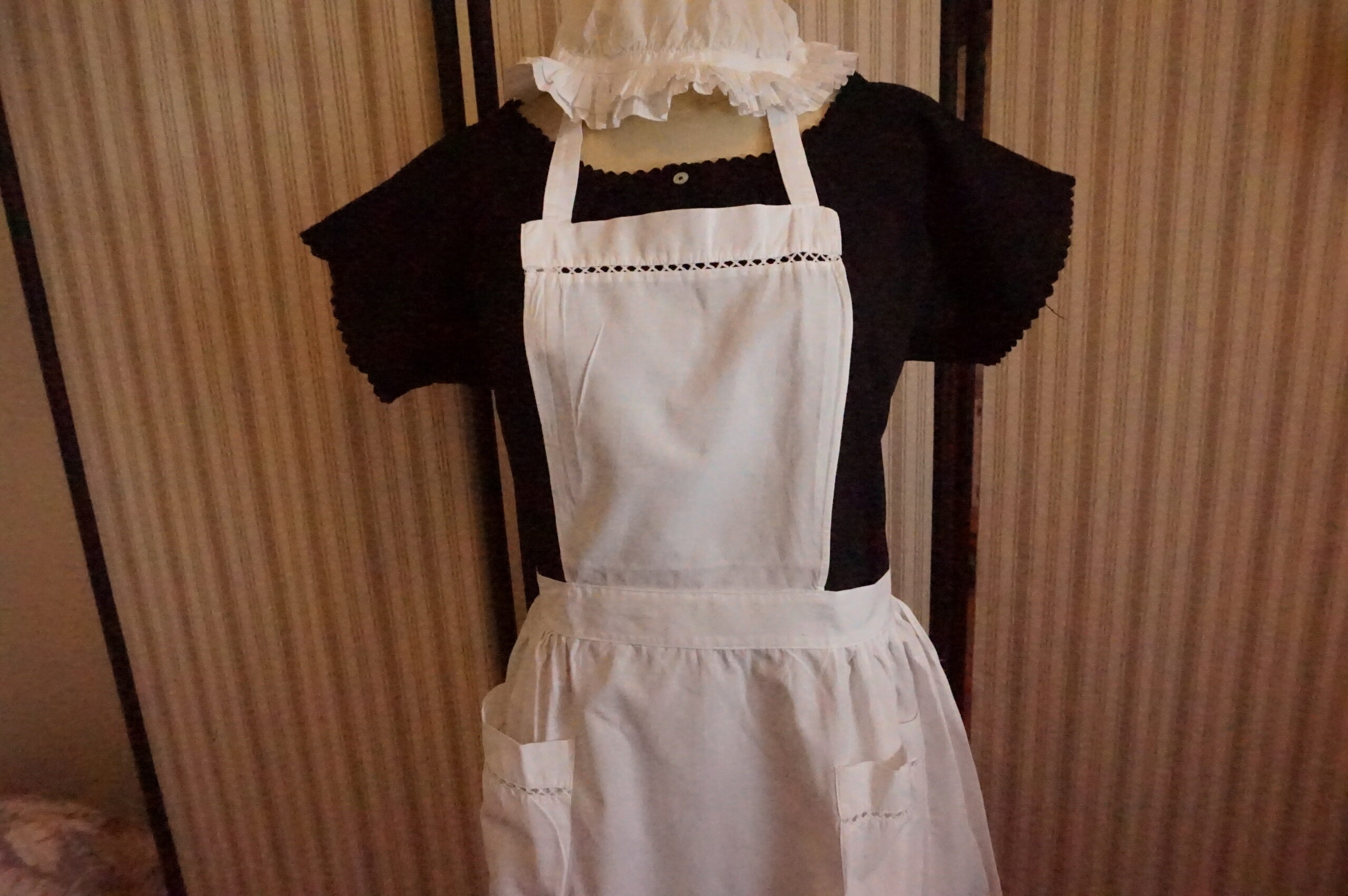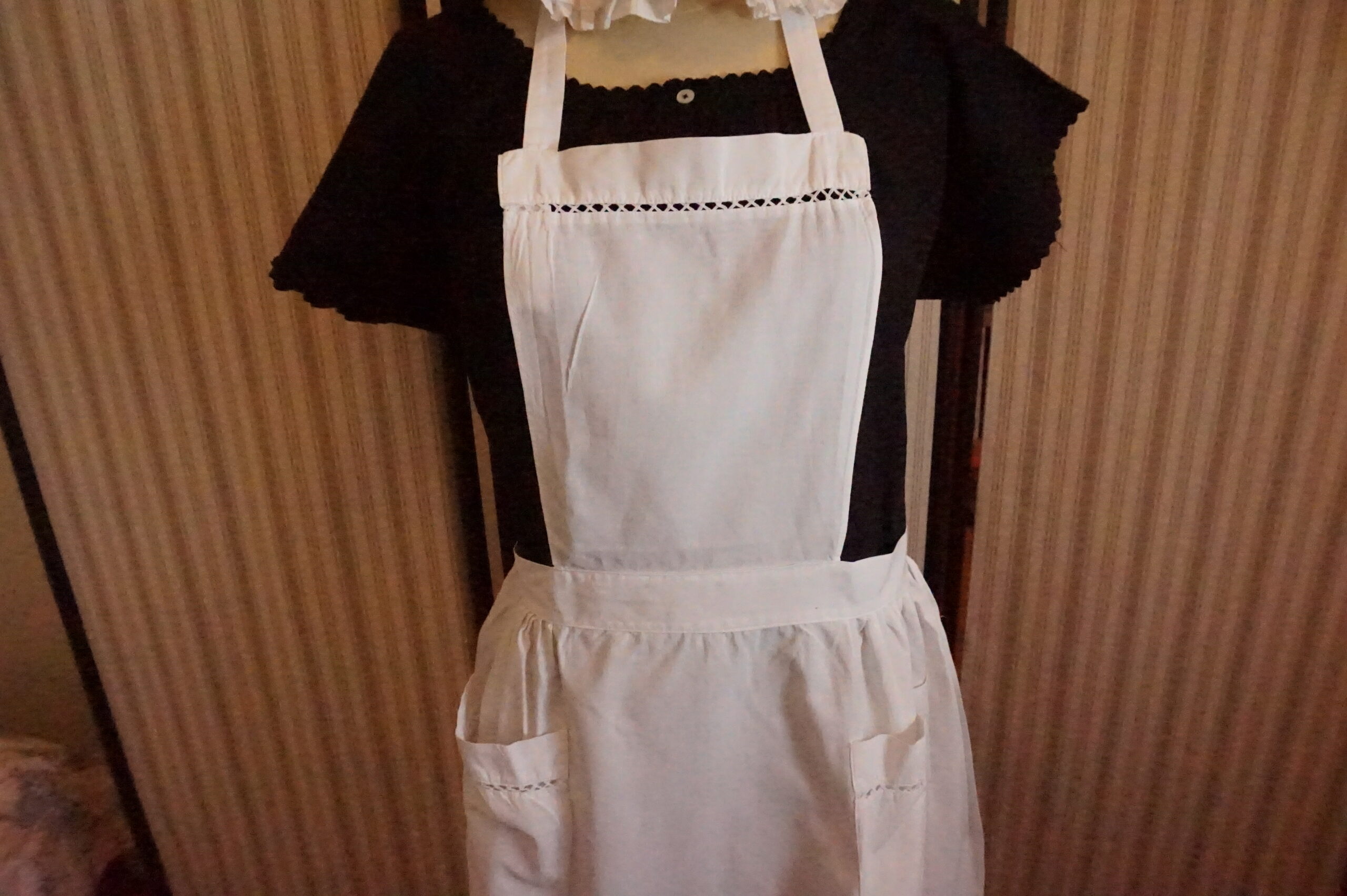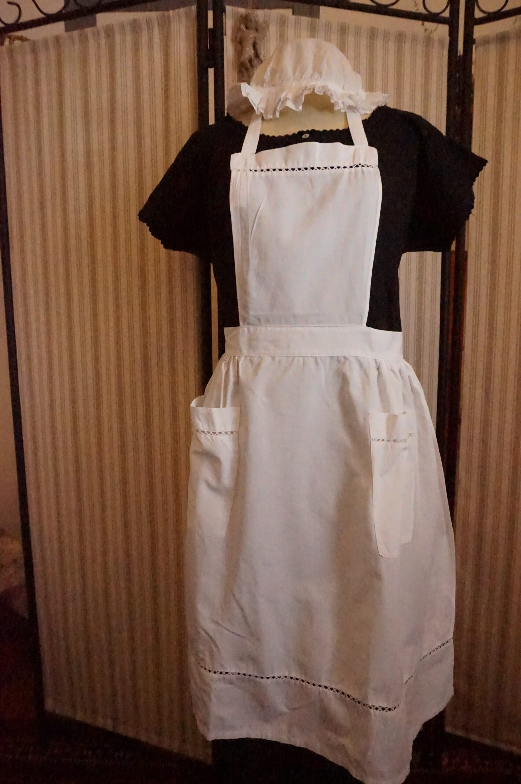 Tablier à bavette femme ,dans un style « gouvernante « création fait main, récent confectionné avec des chutes de draps, ajouré avec 2 jolies poches.