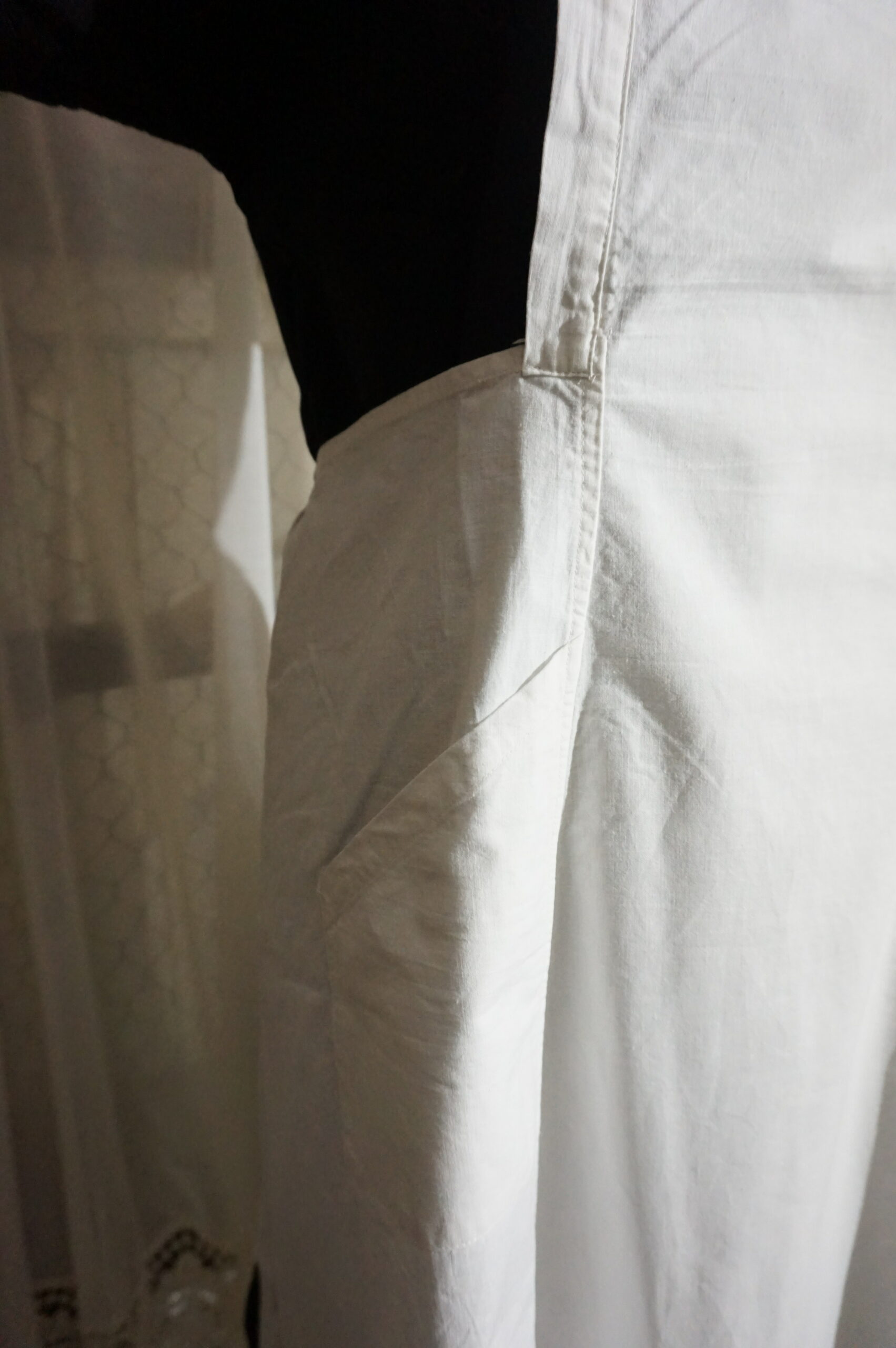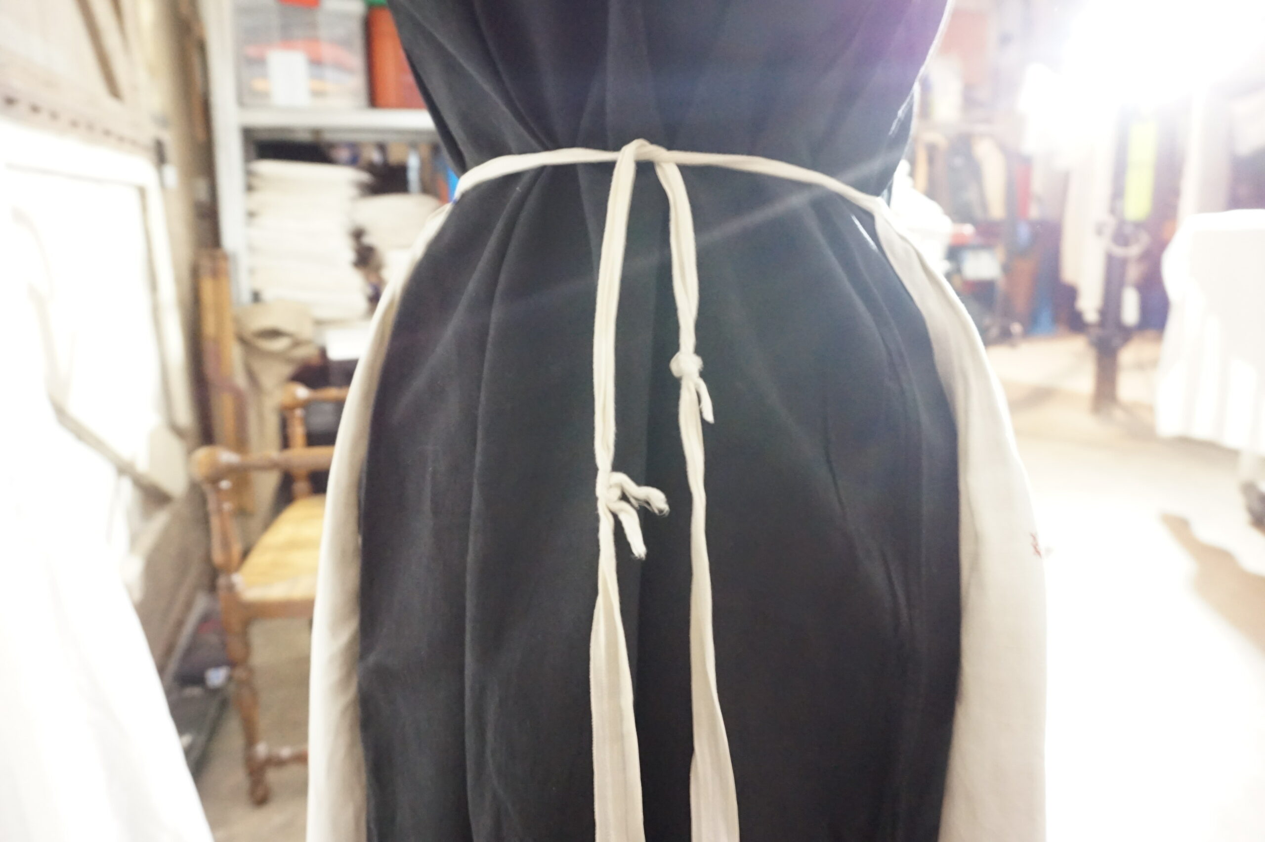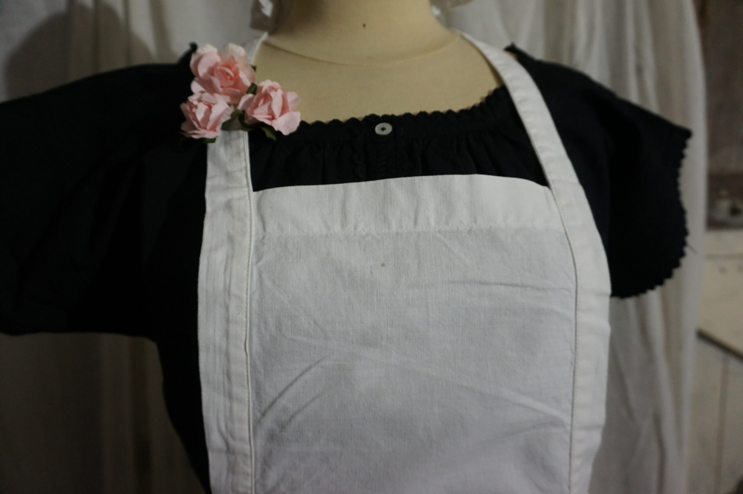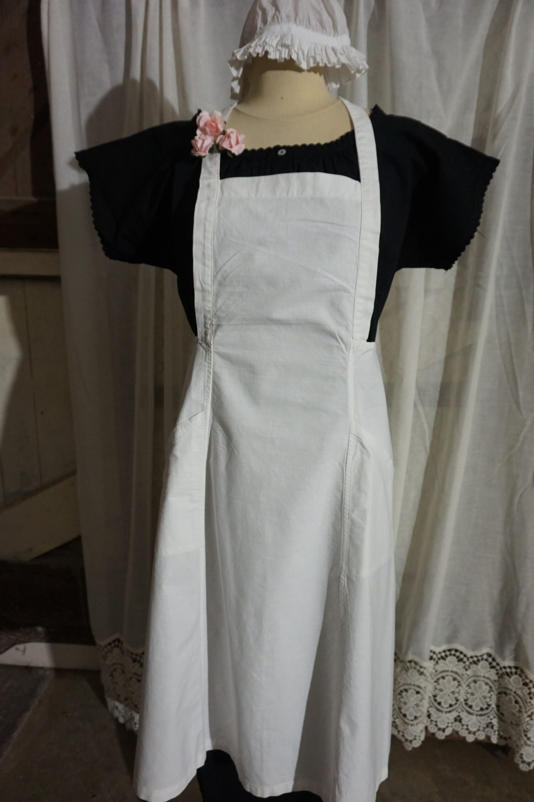Tablier à bavette femme, délicat, avec 2 poches, tour de coup et liens de fermeture à la taille.
