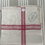 Un torchon ancien resté intact, jamais utilisé, portant encore son tampon d’origine — une pièce rare et lumineuse.